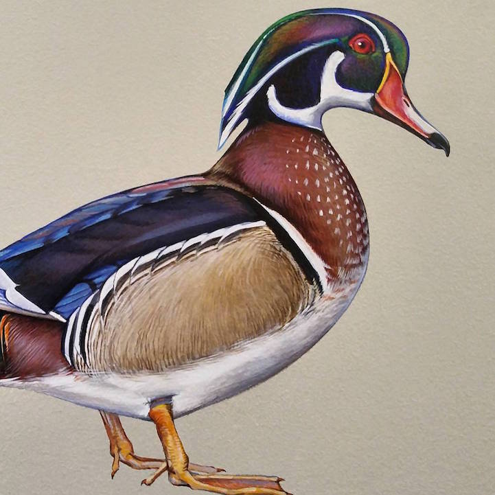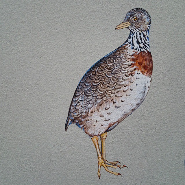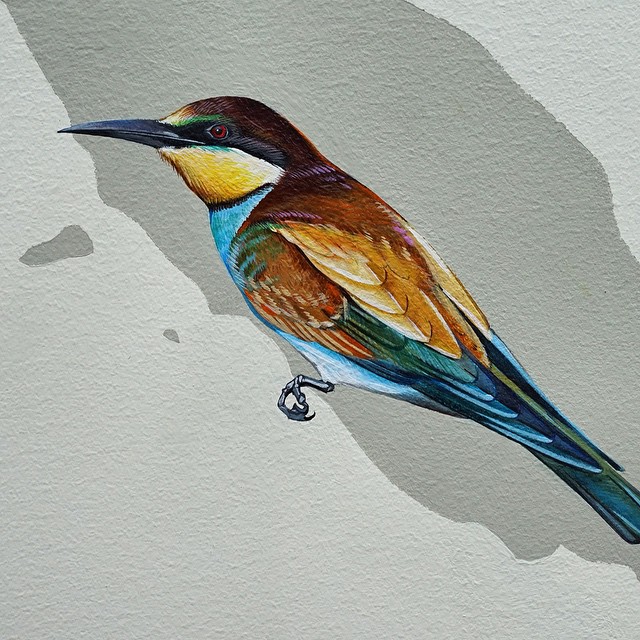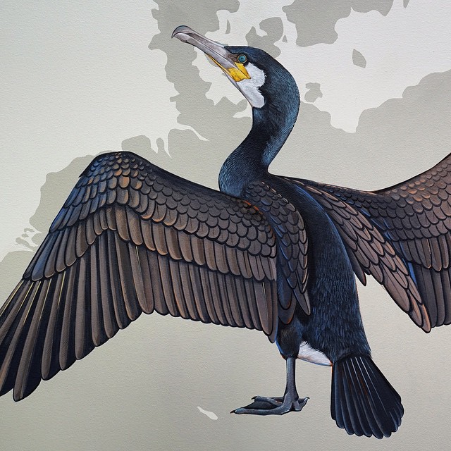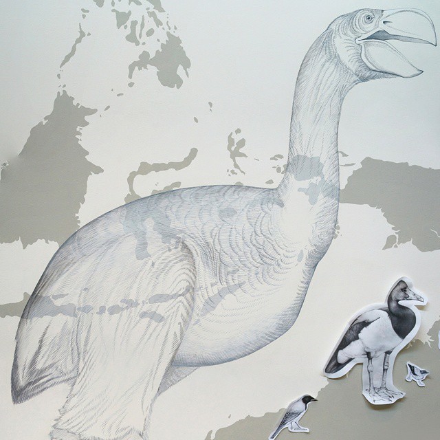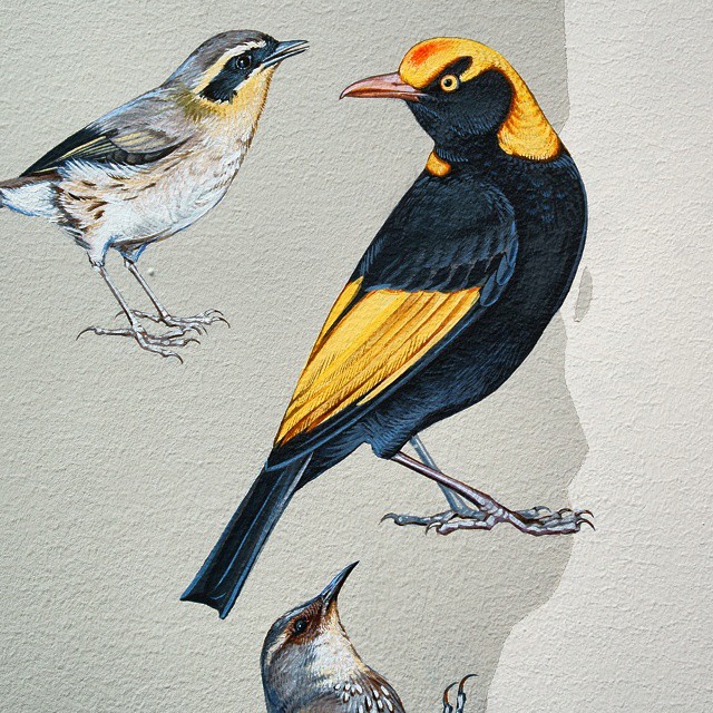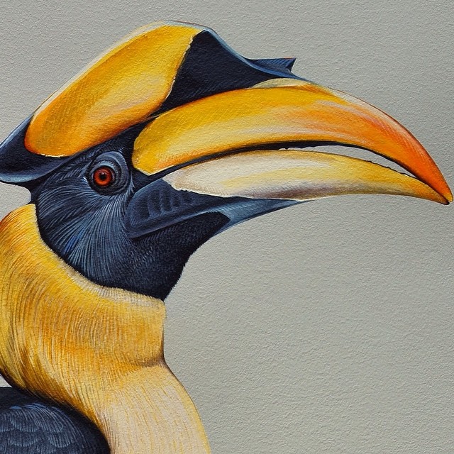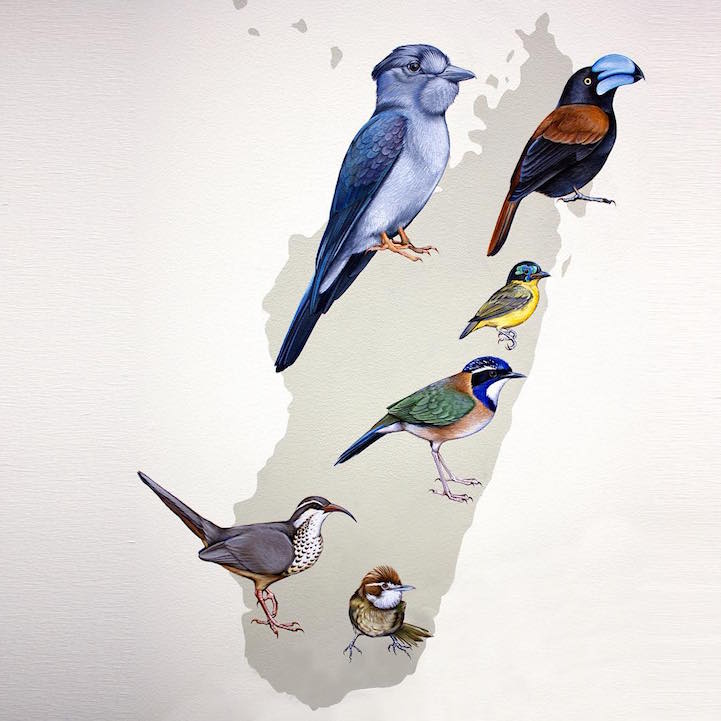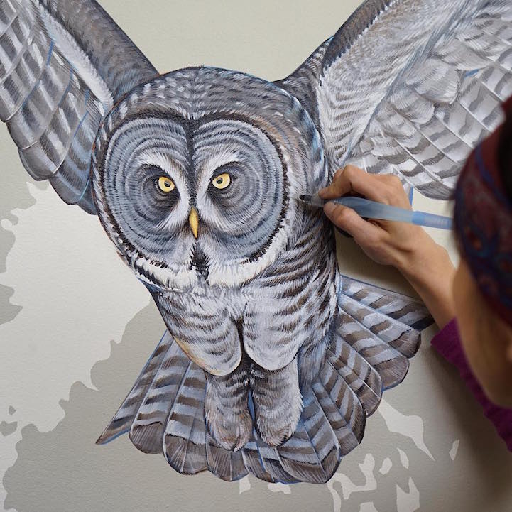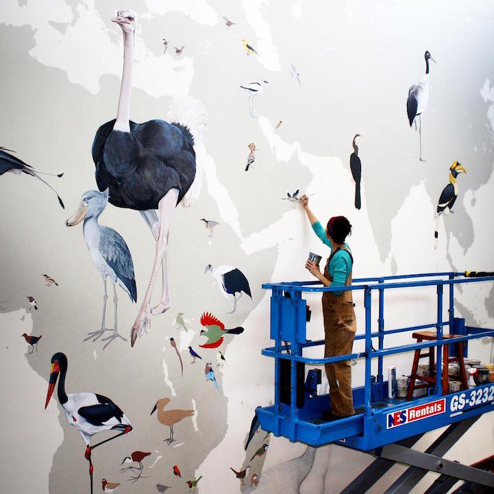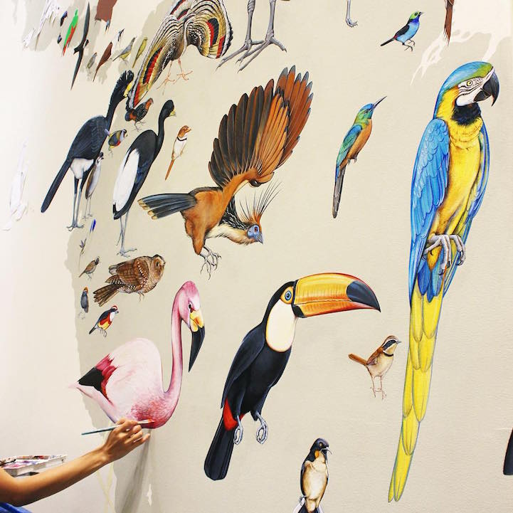 Scientific illustrator Jane Kim (of Ink Dwell) spent over 16 months painting one member from each of the world's 243 modern bird families. To make this feat even more impressive, Kim painted the individual birds to scale in her 40-foot by 70-foot mural. It all began when she was interning at the Cornell Lab of Ornithology and the program's director approached her with this in-depth idea. Immediately, the artist agreed to take on this exhaustive venture and, along the way, she developed a unique relationship with each bird she painted. Kim explains, “When starting a bird, I begin with the eye. Not only does it anchor the animal and inform the rest of the shape–it gives the bird life, a personality.”