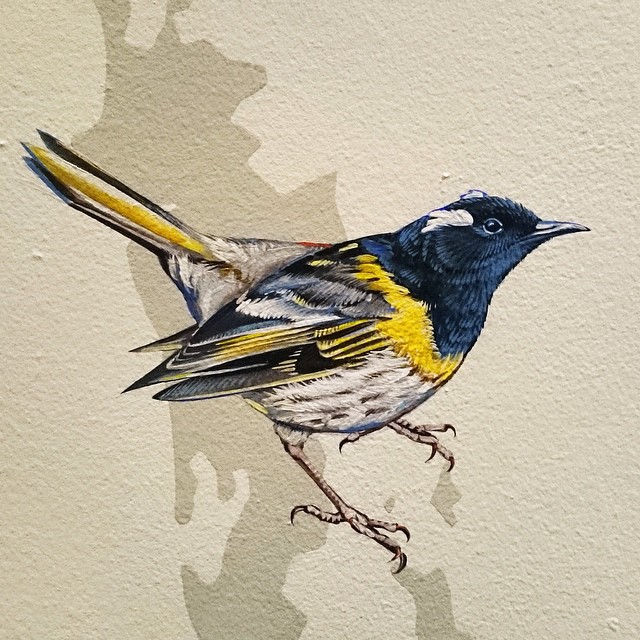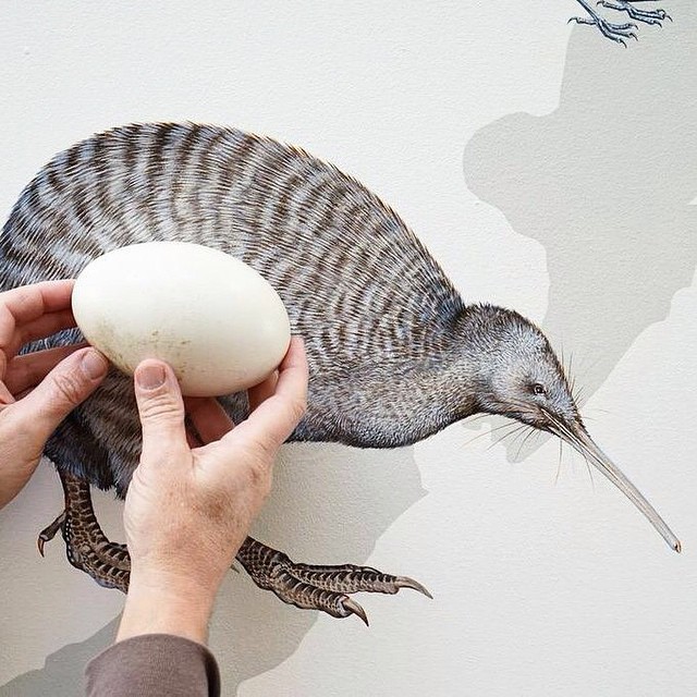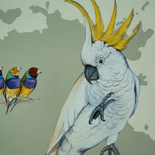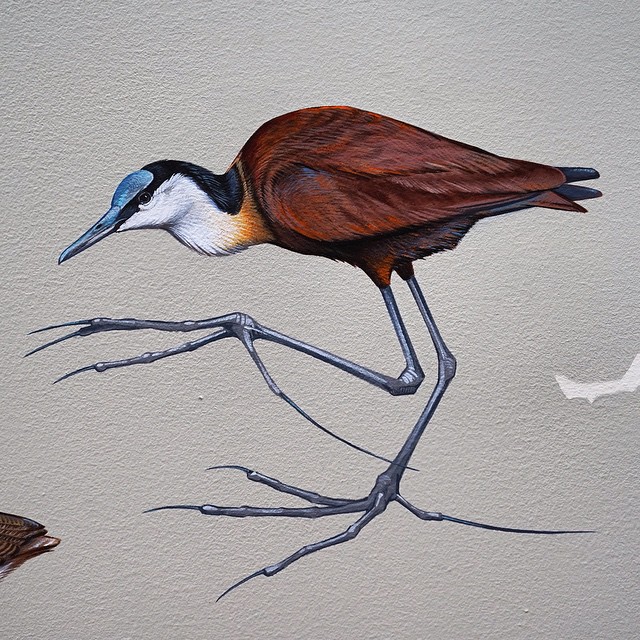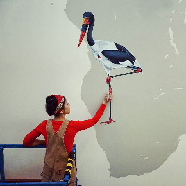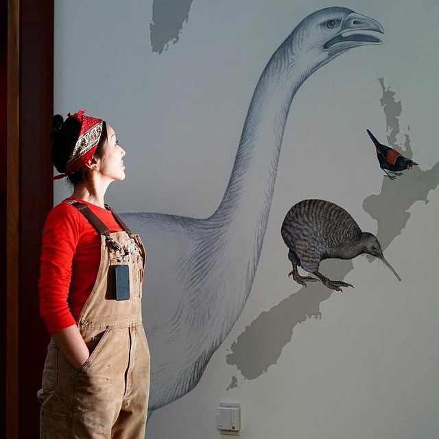 In addition to painting all the birds we can see flying today, Kim also included 26 extinct species by depicting them as ghosted imagery. The disappearing technique adds a thought-provoking element to her mural, causing viewers to reflect on why and how these environmental changes have occurred. “Climate change, ocean acidification, deforestation, these are all huge issues, but really they're just symptoms of a much larger problem: a flawed philosophy about our relationship with the natural world,” Kim told Juxtapoz. “Art can't change the amount of carbon we're putting into the atmosphere, but it can challenge and inspire us to change the way we think and behave–which is the only way we can begin to solve these massive problems.”