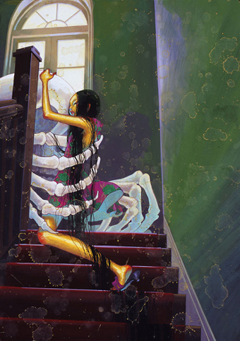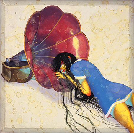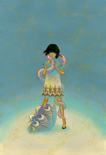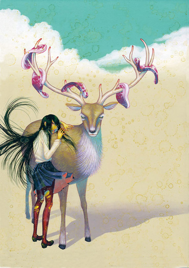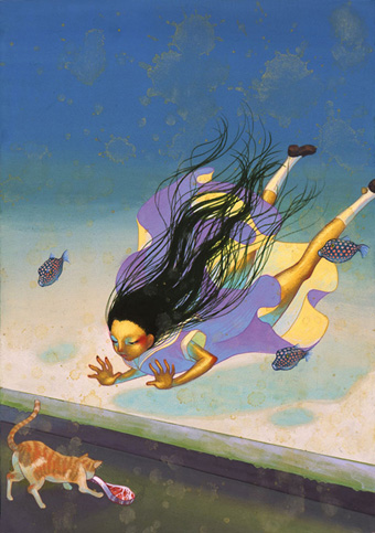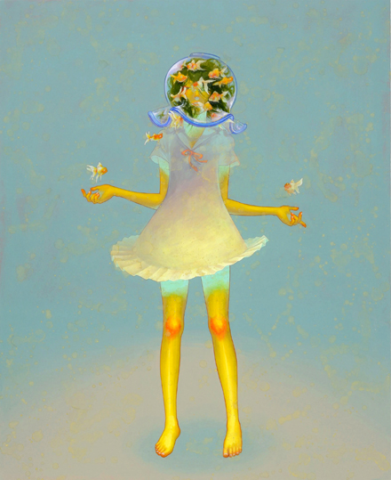 Hailing all the way from Japan, Fuco Ueda is a super-talented artist whose paintings feature beautiful women in surreal situations. To create these intriguing narratives, Ueda paints with acrylic and powdered mineral pigments on paper, cloth, and wood.