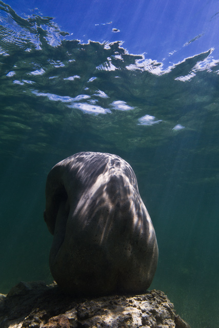 “No Turning Back” portrays a lone female form situated just below the sea's surface easily visible for snorkelers and nestled within the reef system. Her curved back is designed to capture the flickering rays of overhead sunlight created by the undulating surface of the waves. The sadness portrayed in the piece references the recent statistics reporting how Caribbean reefs have seen losses of up to 80%.