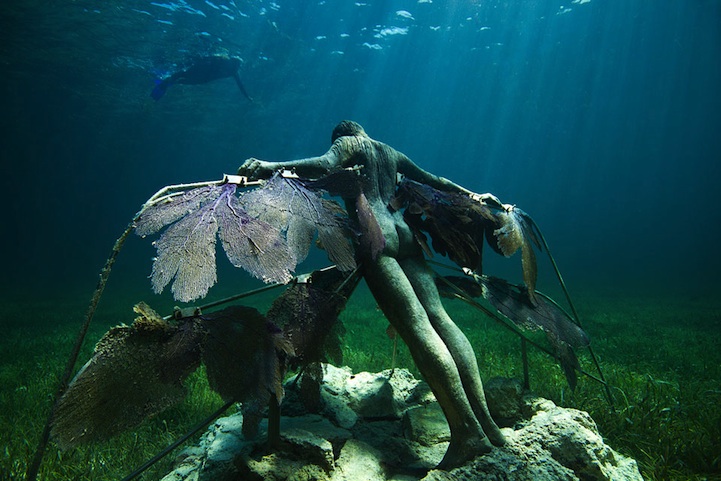 British sculptor Jason deCaires Taylor has just unveiled his latest cement sculptures to join the over 500 others off the coast of Cancun, Mexico. The monumental museum, called the MUSA (Museo Subacuatico de Arte), is one of those unique places to see art, as all of the statues are found underwater. For many of these dramatic new works, he's used live transplanted coral to create thought-provoking narratives. You can see them all below, along with a brief description of each in Jason deCaires Taylor's own words.