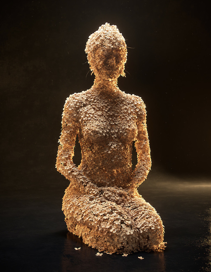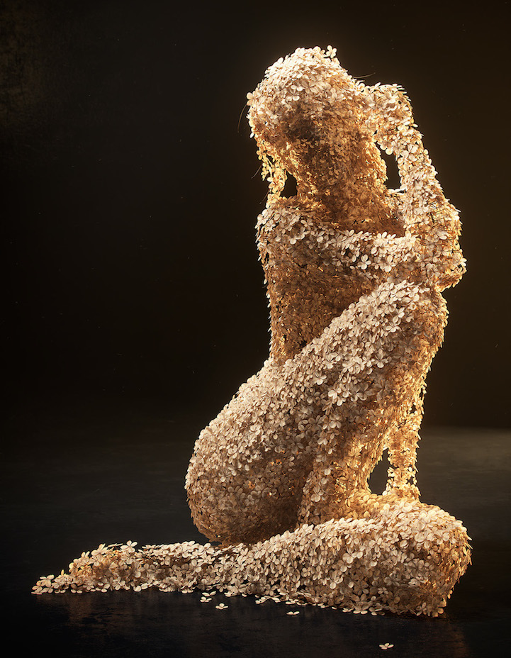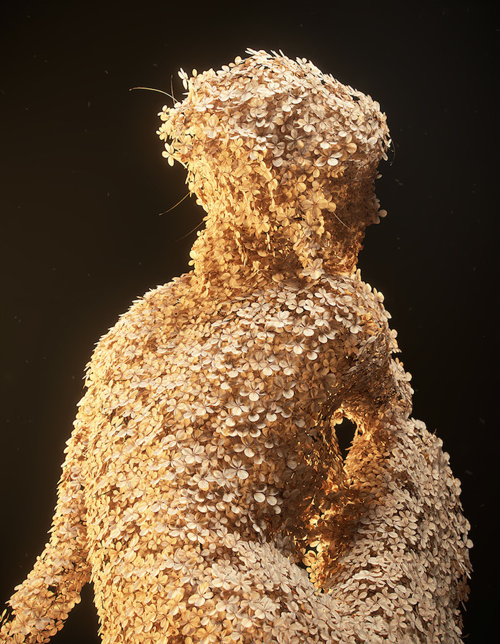 Artist Jean-Michel Bihorel uses real dried blooms to create a stunning digital series called Flower Figures. The French creative says that this project is “a bit more experimental than what I usually do,” as his work typically features characters with a cartoonish look and feel. Here, he's utilized 3D scanning technology to capture a bunch of dried white hydrangeas that were then multiplied and modeled over a female form. The result is a new being that's simultaneously familiar and exquisitely fantastical.