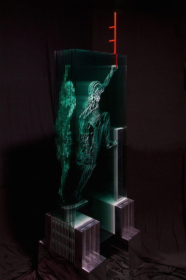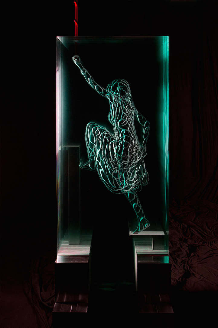 At the intersection of art, science, and technology, Jed Malitz creates life-size glass sculptures of human figures within architectural forms. The New Orleans-based artist describes his works as “4D sculptures of cut glass and refracted light,” illustrating how each subject is defined both physically and non-physically through glass silhouettes and their refracted light. The silhouettes, which are based on live-subject 3D photography, suggest the physical outlines of people through holes cut into architectural glass panels. What's even more amazing, however, is the alternative perspective of the subject that's revealed when viewing the sculpture from a slightly different angle. Redirected ambient light from the silhouettes projects an additional human form on the outer edges of the glass panels, creating a ghostly twin that appears even more detailed and realistic than the solid silhouette.