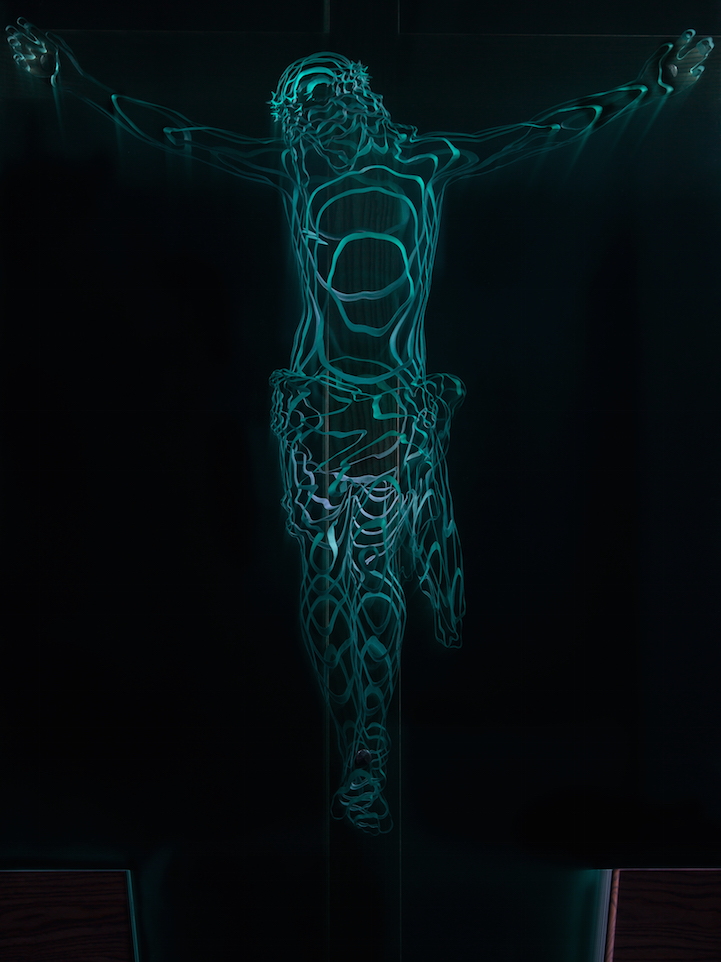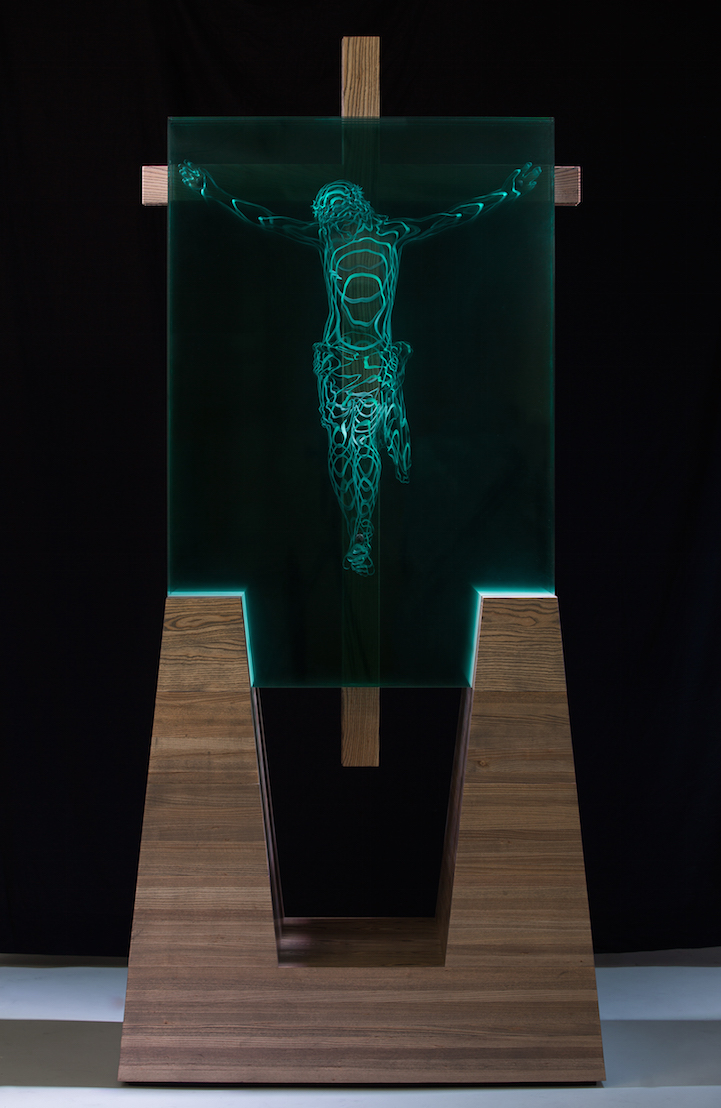 For The Crucifixion sculpture, I was inspired in part by historic works where both Christ and His halo/rays of light were depicted. Instead, I wanted to depict Christ using light itself and thus the refracted light perspective became the focal point. Because there were many new variables in this sculpture, I built Ascent Through the Glass Ceiling as a proof of concept for 3D glass cutting, object embedment within the glass, and stand and hardware design, all of which would be similarly approached in my depiction of The Crucifixion.