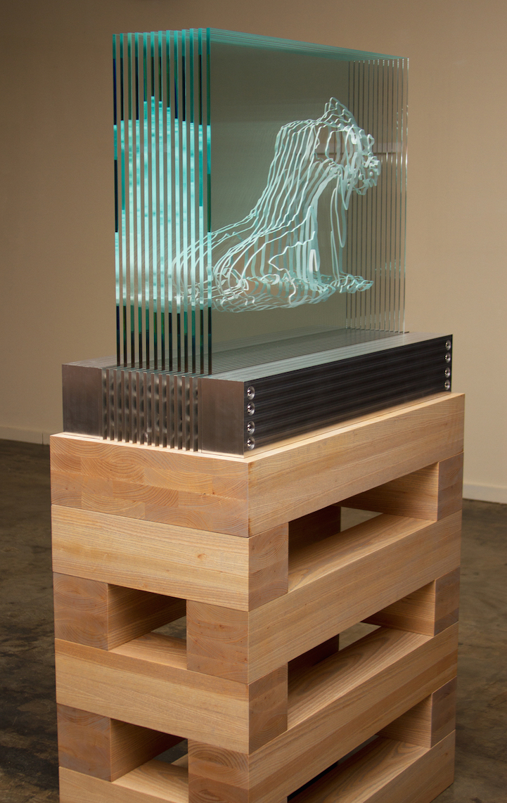 For 3D cut glass sculptures like Ascent Through the Glass Ceiling, digital contours are created in pairs and then adjusted for aesthetics, machinability and structural feasibility. Each contour pair is joined with a set of straight lines that are also adjusted for aesthetics and machinability. The contour pairs and straight lines that join them are modeled as holes in digital flat glass panels and evaluated from every angle.