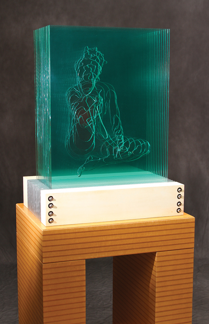 My glass sculptures depict their 3D human subjects directly through the collective edges of 2D or 3D holes in layers of cut glass. With these layers aligned and spaced properly, the (physical) 3D subjects appear in proper proportion. Intuitively, the 3D subjects offer different perspectives as one changes their viewing angle.