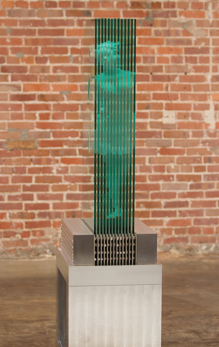 Build: The build phase begins with the various digitally designed 2D or 3D shapes physically being cut from flat glass panels. All glass and stand components are physically created at industrial fabrication facilities, where expert technicians and engineers program machines to shape my artwork and stand designs from glass, metal, or wood, and to exacting specifications. These fabricators are not ateliers; none of the components are made by artisan hands. The entire concept is based on the technology, capabilities, machining and engineering at high end fabricators.