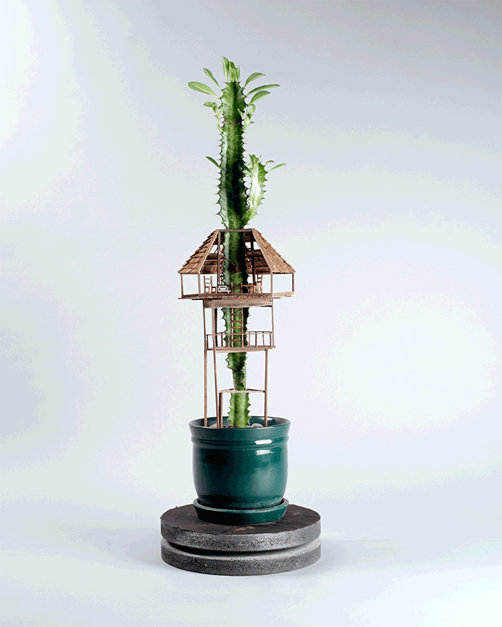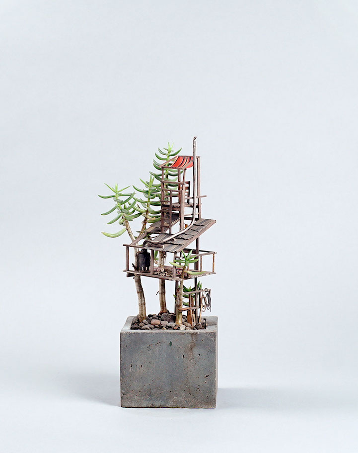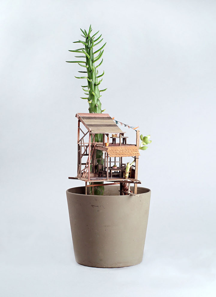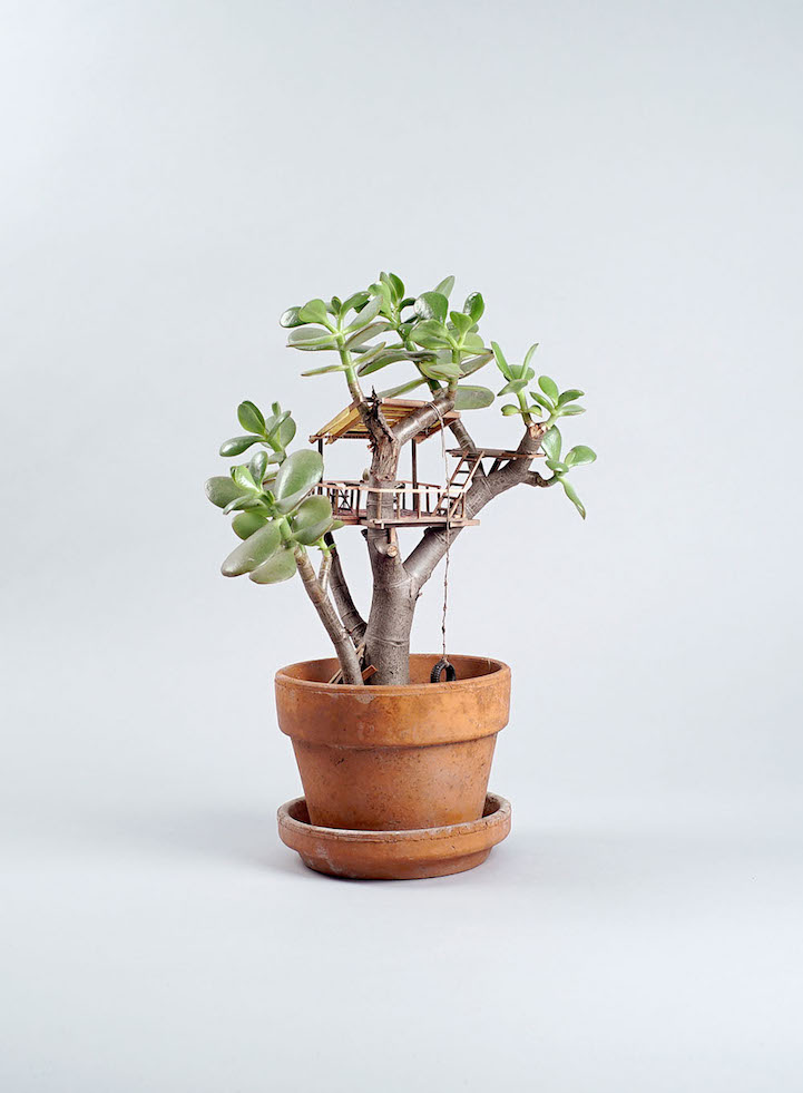 Miniature Tree Houses Meticulously Sculpted Around Potted Plants