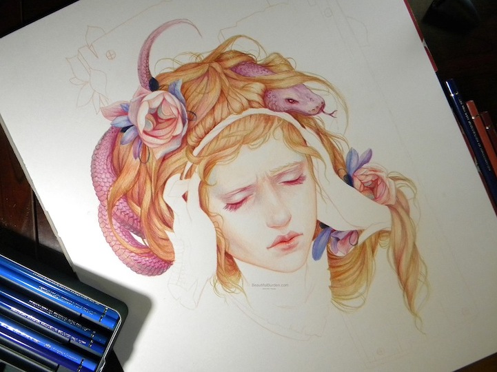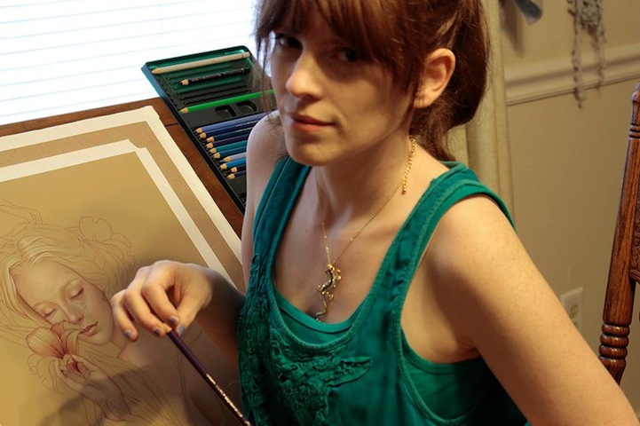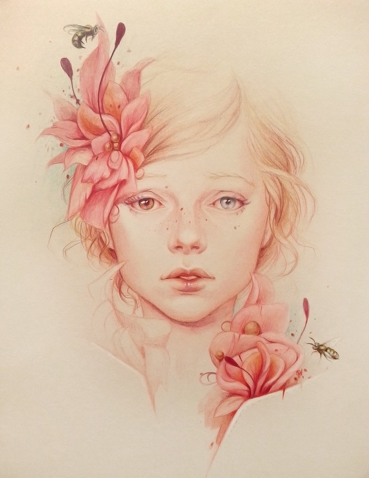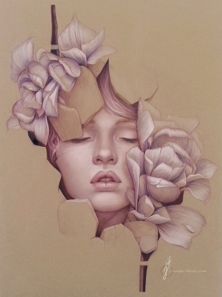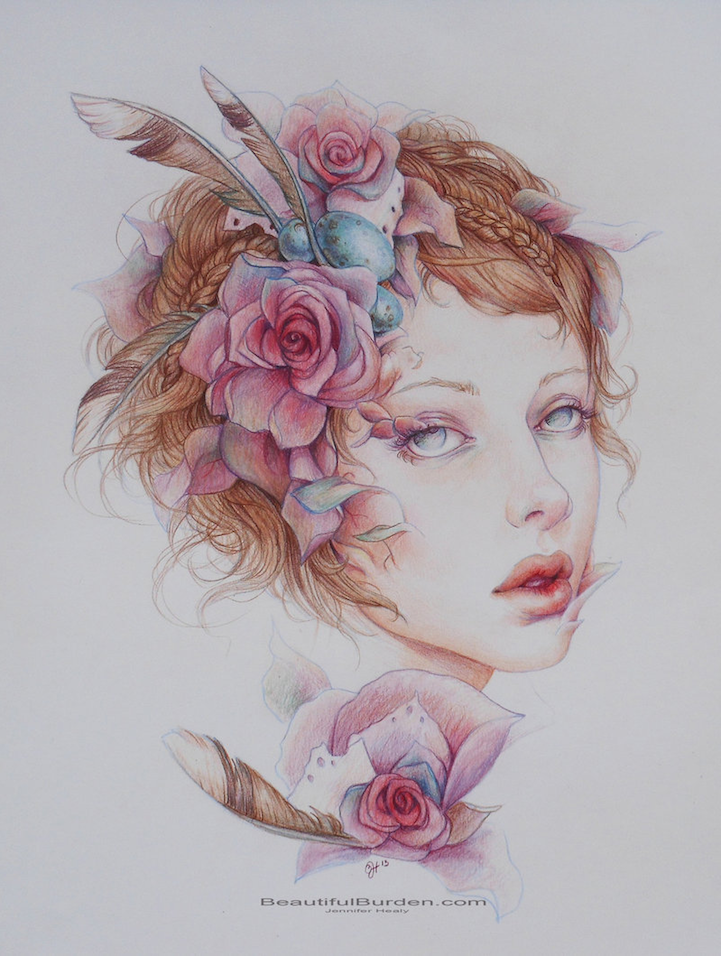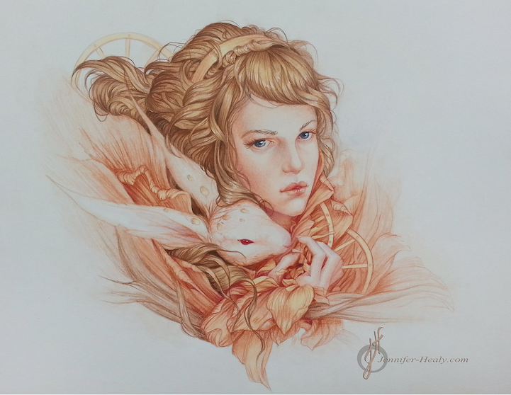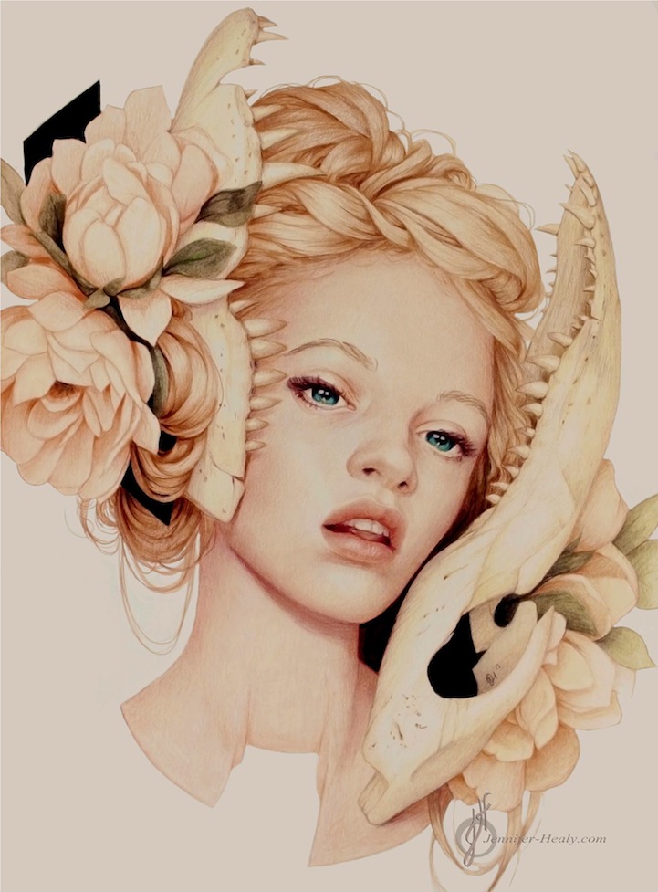 In these alluring drawings, American illustrator Jennifer Healy uses colored pencils to blur the lines between fantasy and realism. Her technically stunning approach blends delicate lines into gorgeously detailed feminine portraits that have a dreamlike quality to them. The young faces stare out with haunting expressions that are both sad and powerfully enchanting.
