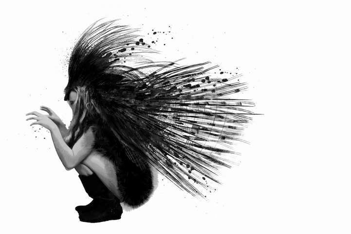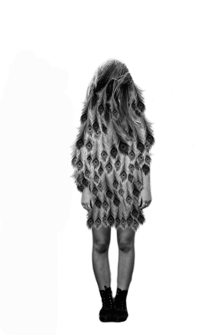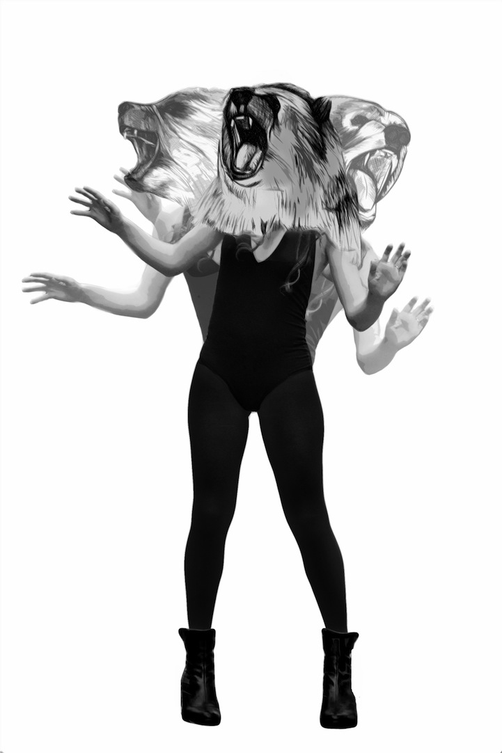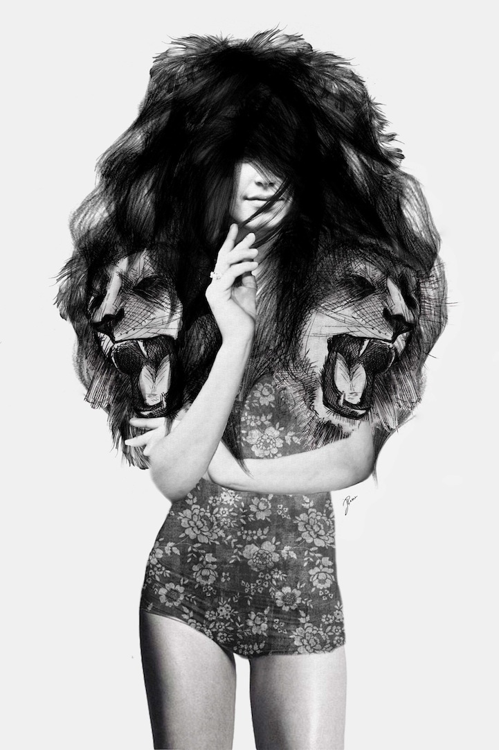 Each image is a mixed media product, created from a combination of photography and pencil drawings. The artist says her work blurs the line between classical and modern modes of creation and often features “themes of femininity, raw animal nature, and surreal fashion.” The monochromatic mix of lines and texture creates a lively, unexpected portrait where soft flowers and elegant females are juxtaposed against the shocking presence of the untamed beasts.