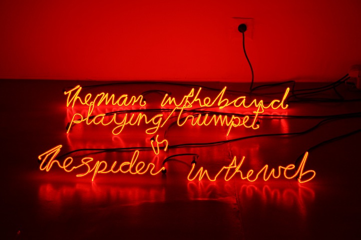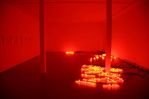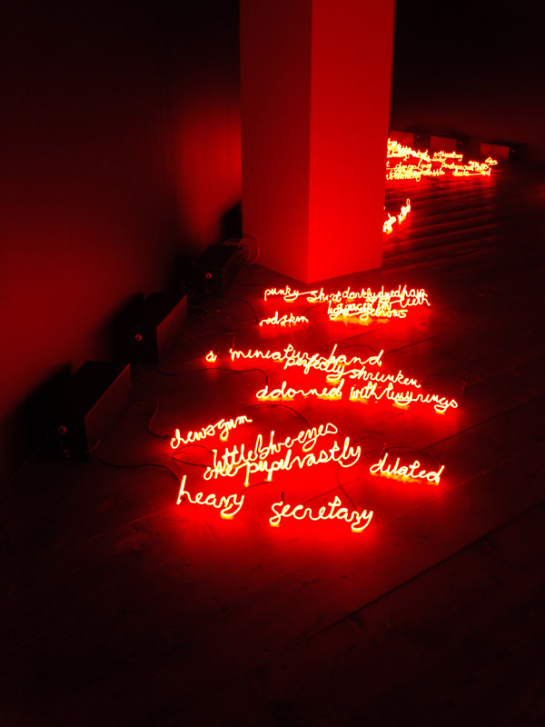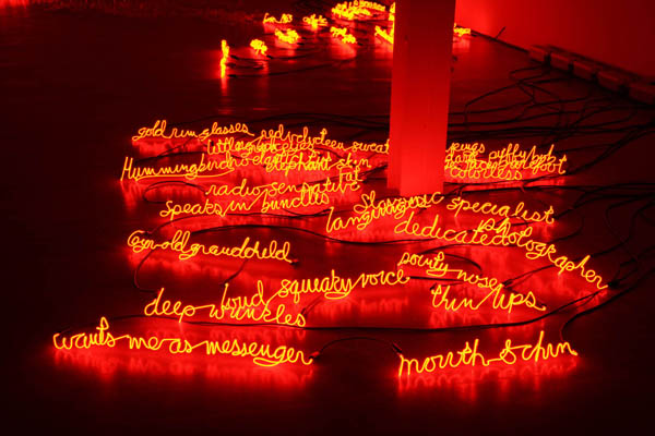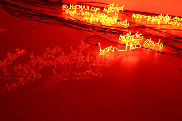 Upon meeting these people, Magid wrote everything she could about them, from their physical features and attire to any few bits of personal information they divulged. After speaking to the spies, the artist proceeded to create her neon lights and accompany them with 18 brief written prints. She completed her project in 2008, but the work was confiscated by the AIVD in 2009 and censored. What remains is an altered fragment of Magid's original work (11 written prints and 7 blank pages to complement the neon lights). Even the fiery hue of the lights, appearing like flames on the floor of the space they inhabit, have been affected. The lights corresponding to the 7 confiscated prints have been permanently turned off as per the Organization's request.
