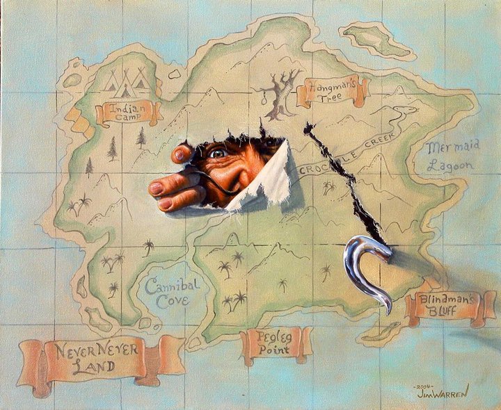The surreal imagery of a tiny face or hand poking through a partition offering a splash of color and excitement on one side is so thrilling. The subjects all want so desperately to touch their reveries and, thus, break the barrier between fantasy and reality to fully realize their dreams. It's really fascinating that we see children's heads pop out of the canvas, whereas adults only allow their hands to venture forward (with the exception of Captain Hook and the artist himself). As adults, we are able to create fantasies, but can we actually see them? Do we truly believe they are within reach?