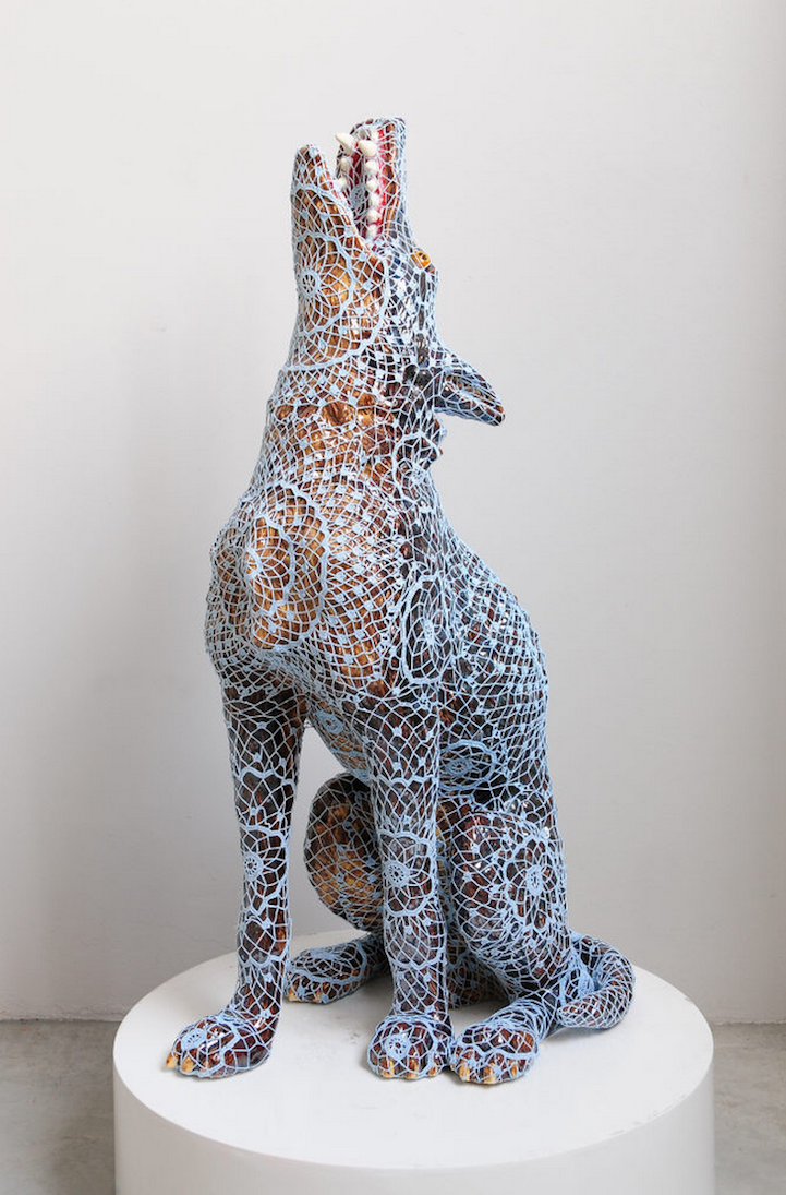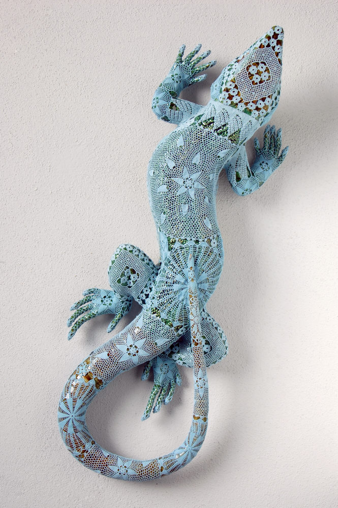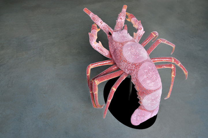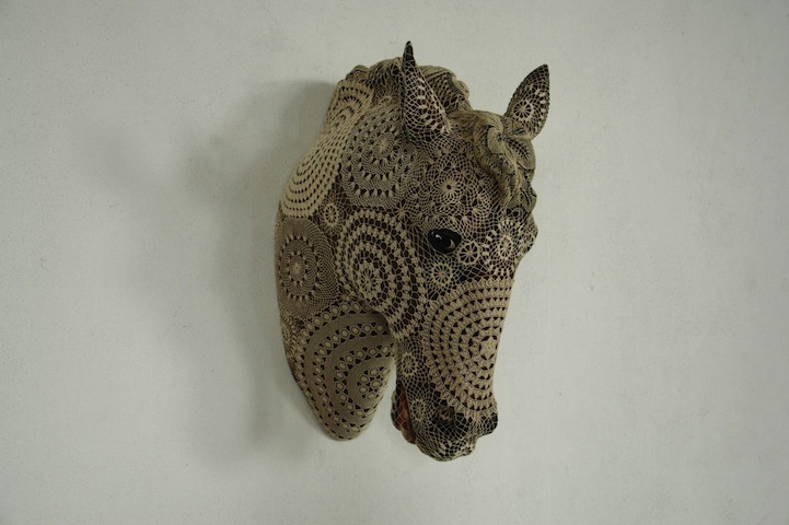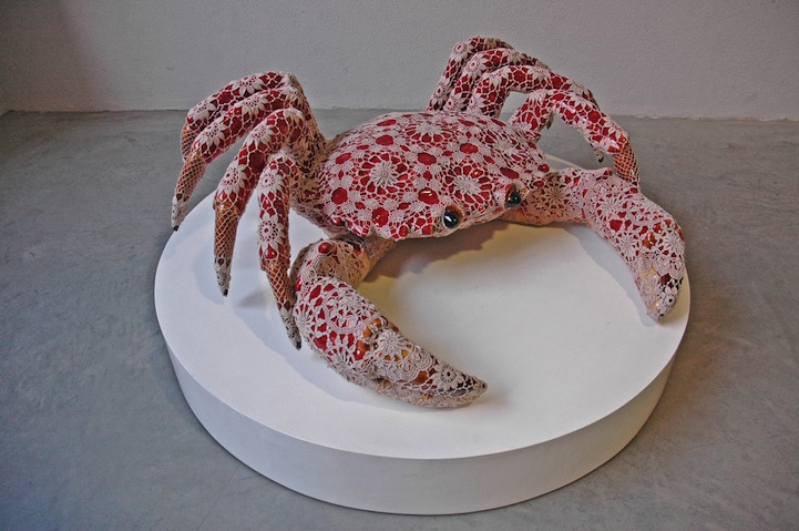 In this series of crocheted animals, Vasconcelos envelopes ceramic, plastic, and rubber sculptures, created by Rafael Bordalo Pinheiro, with delicate patterns of handmade cotton crochet and lace. The intricate details of each handmade creation are evidence of the artist's extreme technical skills and she presents her viewers with the strength and resilience of a craft that is typically associated with softness and effeminacy. Circular patterns, flowers, and swirls cover the surface of various and quite unrelated animals, including a snake, a crab, and the bust of a bull. In each impressive piece, Vasconcelos blurs all kinds of boundaries, including that of artistic ownership, as she covers someone else's sculptures in her own handmade work.