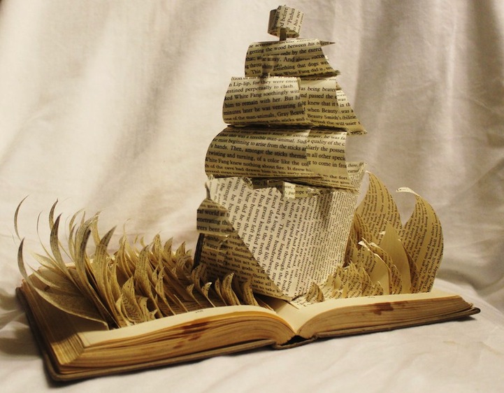From Moby-Dick and Tom Sawyer to Twenty Thousand Leagues Under the Sea, Harvey-Brown manages to capture the momentous and memorable action of each respective novel as they emerge out of the two-dimensional surface of the text and reconfigure themselves as three-dimensional structures. Placing her piece atop open-faced books heightens the imagery, allowing one's imagination to excitedly revel in the visual.