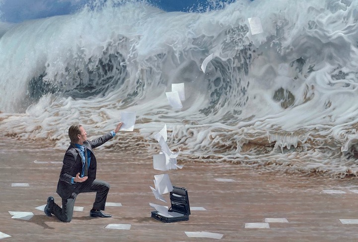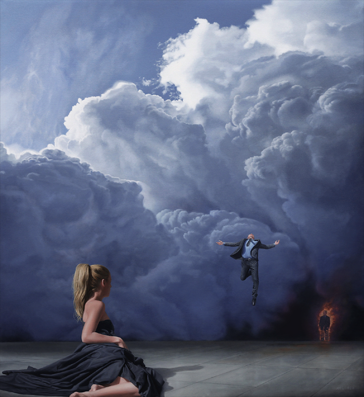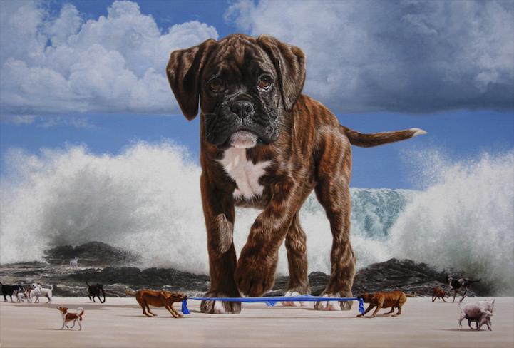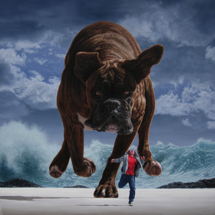 In his extensive collection of surreal paintings, artist Joel Rea takes us on extreme adventures. His hyperrealistic landscapes and portraits feature everything from swirls of stormy winds and water to giant dogs chasing tiny people. Using brushes as thin as just a few hairs, the Australian artist spends hour upon hour meticulously developing his oil paintings until they are smooth, saturated and insanely detailed scenes of imaginative realities.