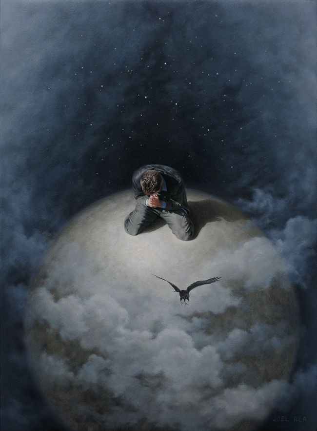 Before he even puts brush to canvas, Rea spends time researching and envisioning his images. He draws from various media, pre-visualized designs, and photo shoots in order to blend several elements into one final and often disorienting picture. Through his own manipulation of the scene, Rea produces art that reflects the richness, detail, and complexity of life. He says he puts the many layers of himself into a story, and he is most interested in the human condition and the darker side of emotions. He says, “It's so easy to smile when you are winning but I guess in life it's what you do in your darkest hours that are the most interesting because that's where you are really challenged as a person and that's where truth can really come out.”