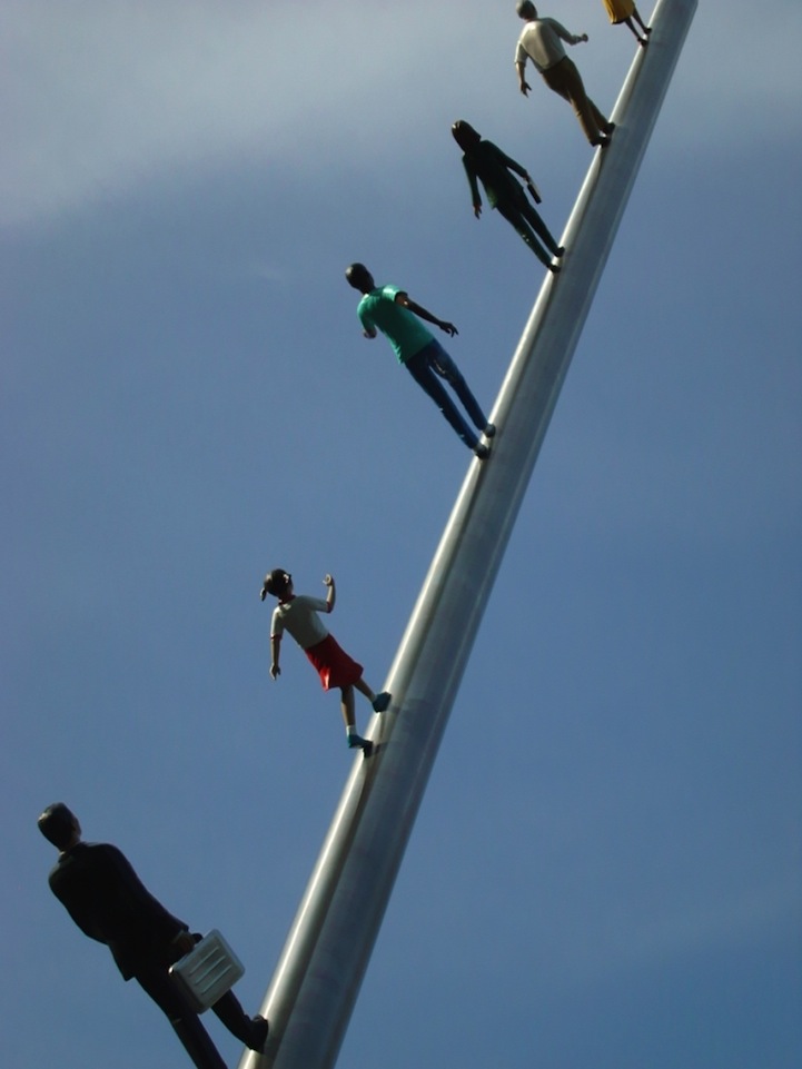 Walking to the Sky is a gravity-defying stainless steel and resin sculpture by artist Jonathan Borofsky. The public art piece, which is essentially open to interpretation, features 10 life-size figurative sculptures walking up a 30-meter-tall pole, breaking the boundaries of physics as we know it. The sculptor describes the installation as “a symbol for our collective search for wisdom and awakened consciousness.”
