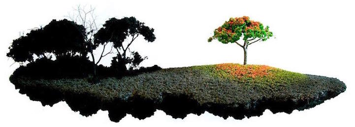 Artist Jorge Mayet sculpts miniature landscapes that look like they're islands floating in an infinite abyss. The small works, which appear against white gallery walls, create the illusion that they've splintered from the ground. Their roots and soil are exposed beneath luscious green grass and tiny homes. While these scenes appear peaceful, some of Mayet's other artworks aren't as tranquil. They explode in mid-air as bits of debris hover in the sky. Green painted sponges, paper mache, wire, and cloth all form these minuscule worlds.
