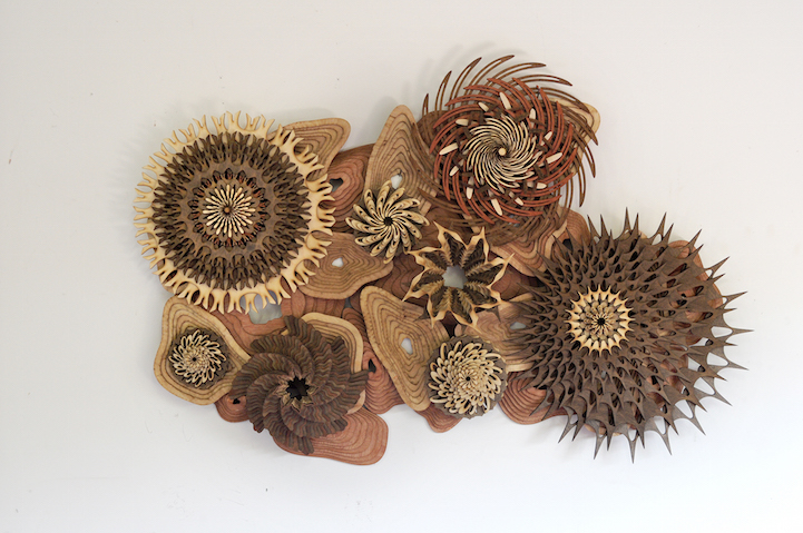 English-born, California-based artist Joshua Abarbanel layers precisely cut segments of wood to form intricate sculptures defined by stacks of organic and geometric shapes. Effortlessly combining free-form curves with rigid repetitions of spikes and swirls, Abarbanel constructs elaborate pieces that recall the randomness of nature and the order of manmade mechanisms.