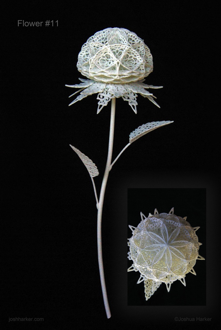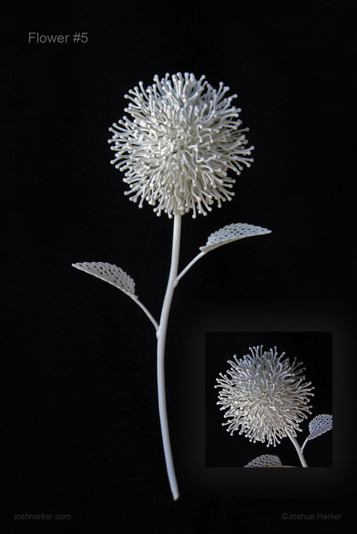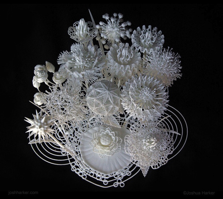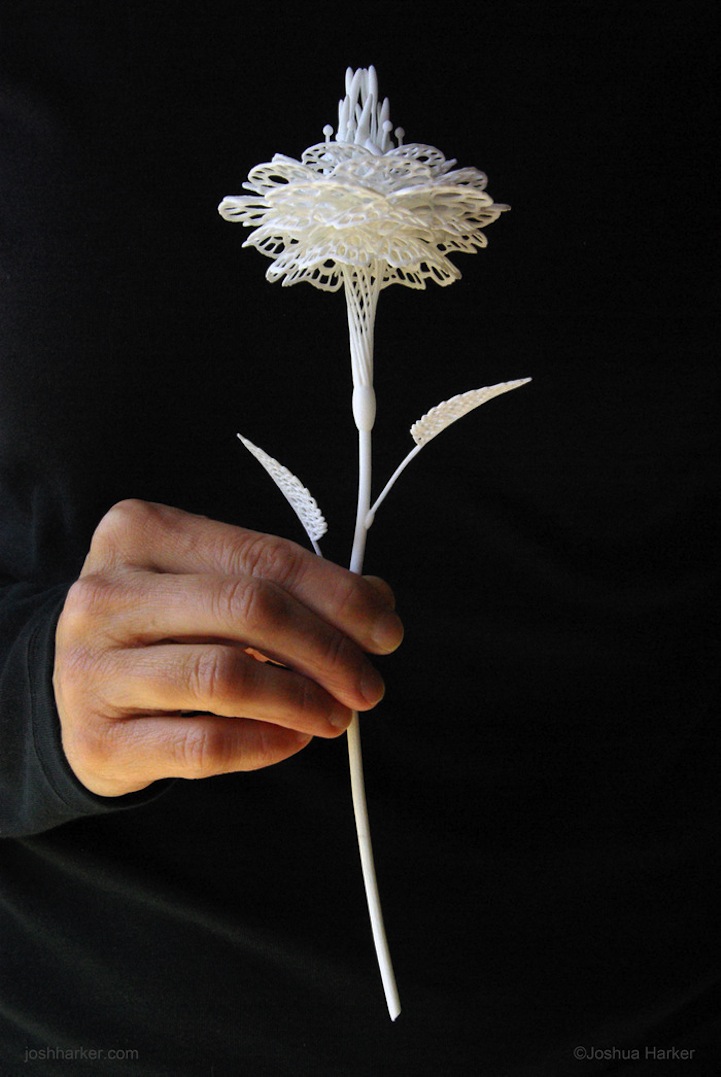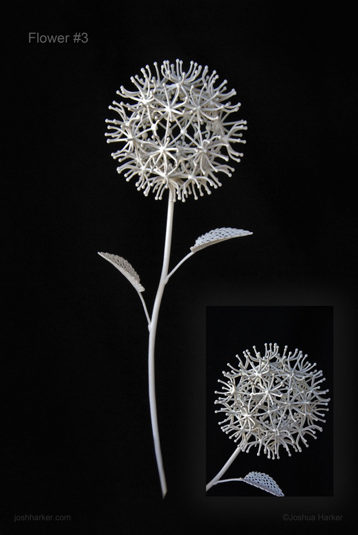 Harker has put his own funding into his development of the next generation of 3D printing, but has recently launched a Kickstarter campaign to help him complete his research. In exchange for financial support, the artist is offering this stunning series of 3D printed filigree flowers, entitled Mazzo di Fiori.