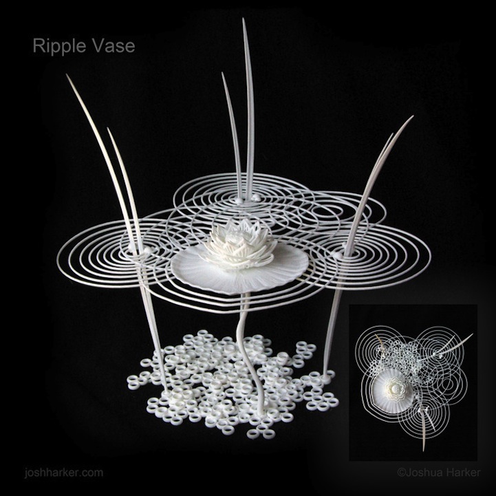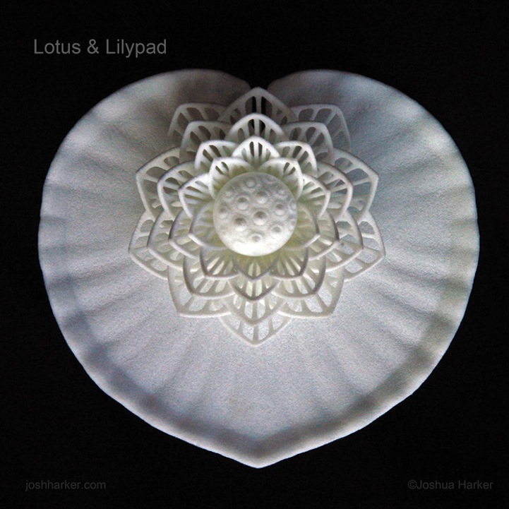 The small bouquet includes 12 10-inch tall flowers, a lotus lily pad, and a ripple vase, all of which have been printed in SLS polyamide (essentially a nylon powder fused together with a laser). Since the artist is asking for help, he figured what better way to say thank you than with a bouquet of flowers. He says, “The composition celebrates the harmony & beauty of opposite & opposing forces. The water surface depicts the plane of separation between liquid & gas with the reaching flower transcending & binding both worlds… an environmental yin yang.”