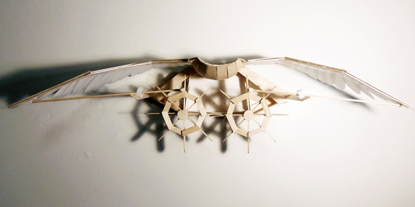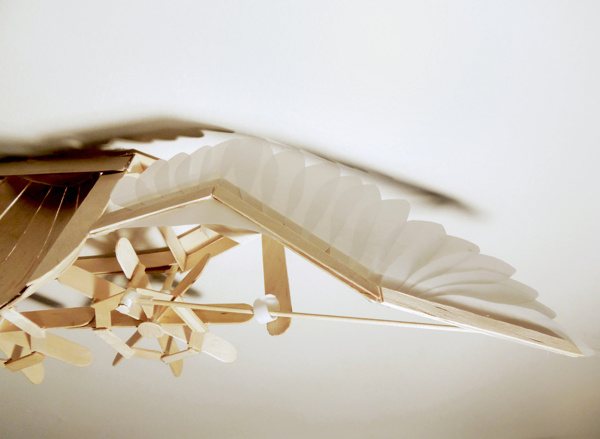 Design student Joyce Lin replicated a bird flapping its wings using simple machines and materials. The kinetic sculpture is entitled Study in Bird Motion and is made with popsicle sticks and mylar that resembles feathers. It's activated by a hand crank, which sets the entire thing in motion and mesmerizes you as its movements resemble a bird gracefully taking flight.