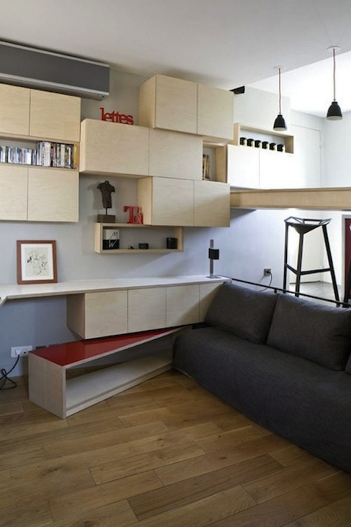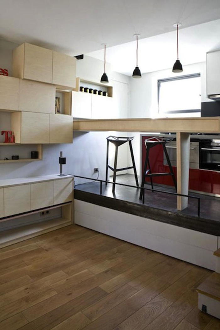 For anyone looking to maximize on a small amount of living space, this innovative bed design is the perfect solution! Architects Julie Nabucet and Marc Baillargeon teamed up to convert a tiny 130-square-foot space into a functional apartment for a student living in Paris. They used every bit of space in the room–formerly a master bathroom of a larger apartment–to maximize on both efficiency as well as modern style.