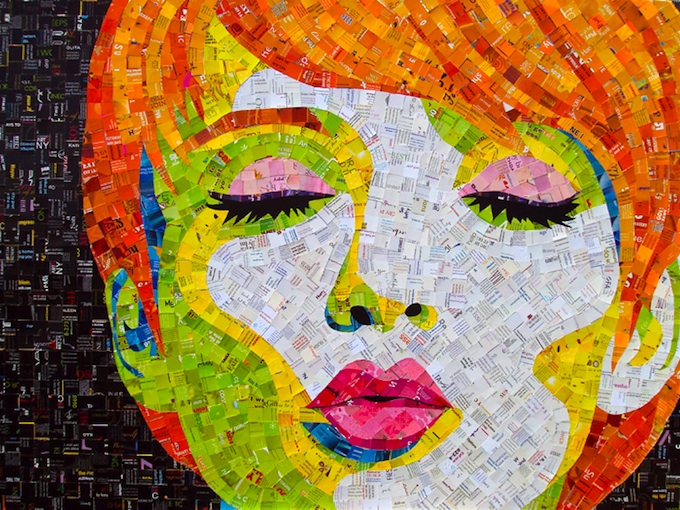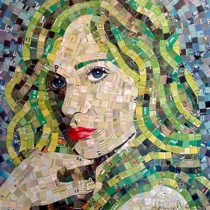 If you ever thought you needed to spend a lot of money buying art supplies, then check out these modern-day mosaics by Sandhi Schimmel Gold. Schimmel takes any paper waste he can find (junk mail, calendars, postcards, photos, old greeting cards, etc) and then assembles its pieces to create a portrait. “Absolutely no technology, programs or dies are used to create my art,” he says. “It is hand-painted, hand-cut, hand-applied, hand-embellished, and hand-finished.”