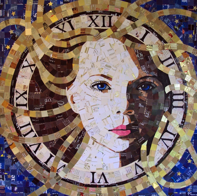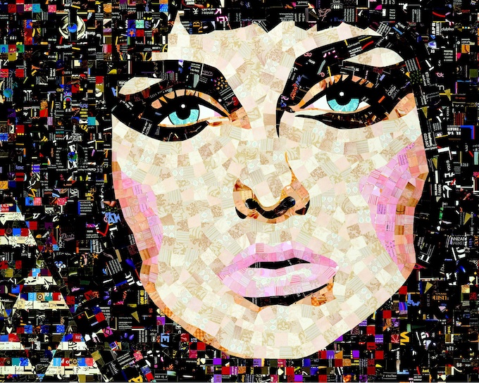 “My work reflects our society's obsession with beauty through advertising – and the endless images that bombard us daily,” Gold says. “It is a purposeful intermix of images derived from advertising and thousands of incongruent pieces – images and text – from advertising that arrives through my mailbox. Assembled like a mosaic; the paper tiles create an entirely new image – an eclectic and tactile portrait reworked in my imagination, utilizing materials that would otherwise go to waste.”
