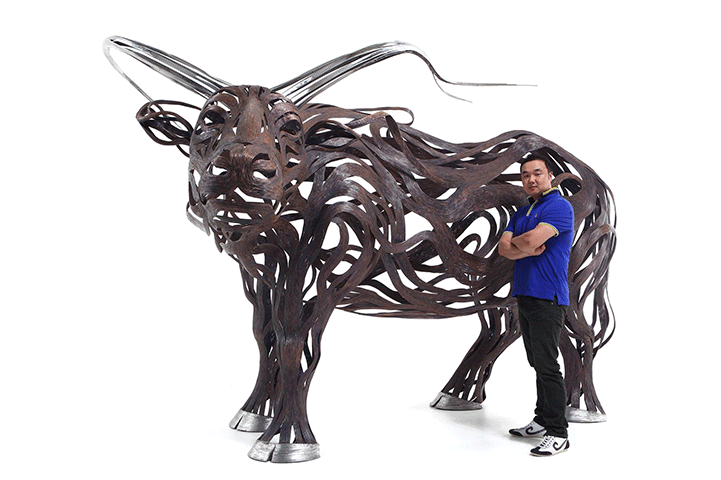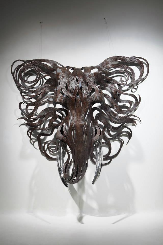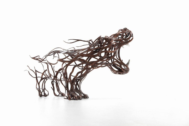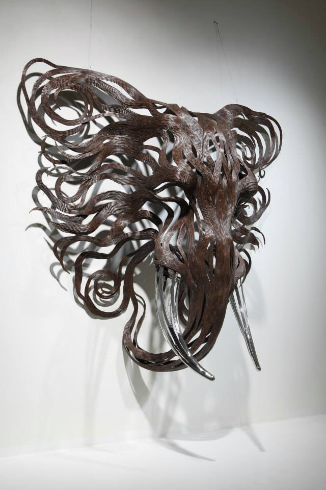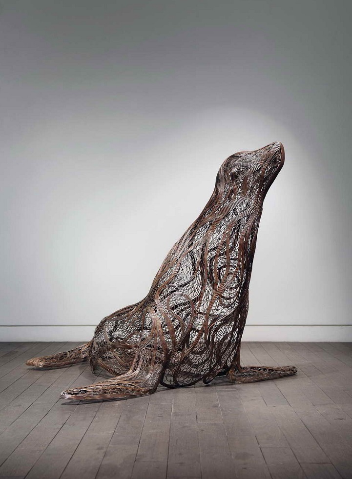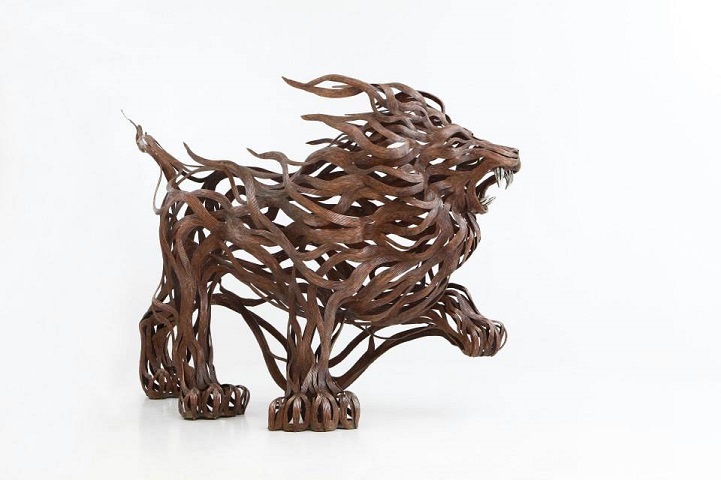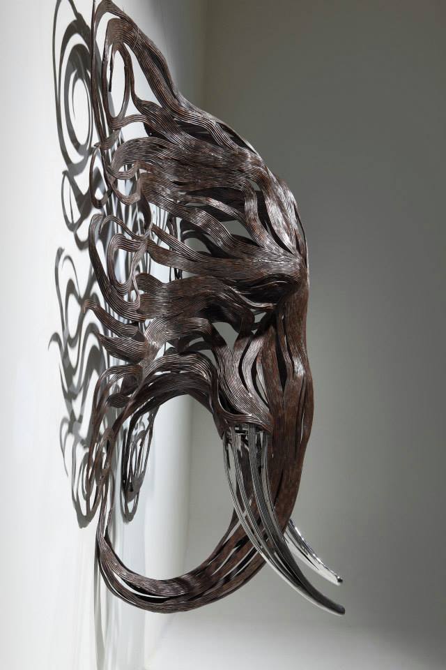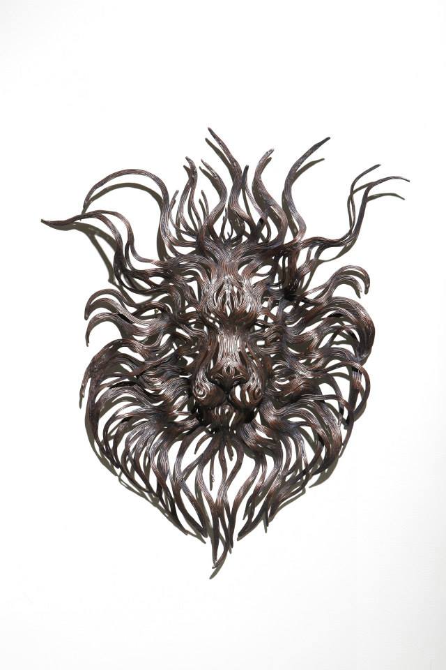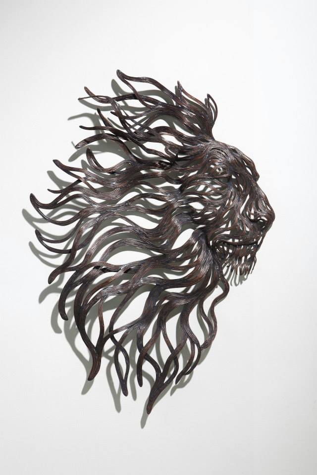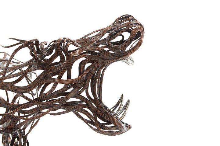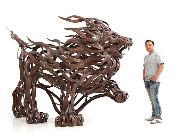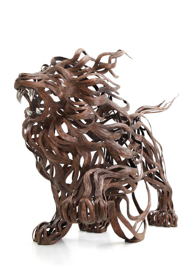 The sculptures are time-consuming and labour-intensive projects as dozens of individual strips of metal are welded into fixed forms. Varying the length and thickness of the metal, Kang creates the lifelike illusions of skin, fur, and hair; and stainless steel is converted into lustrous claws and teeth. From the playful seal to prideful lion, all of his animal structures contain a sense of dynamism that belies their unmoving nature.
