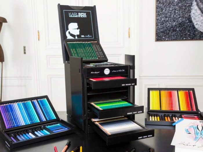 Iconic fashion designer Karl Lagerfeld has recently unveiled a new creation, and it has nothing to do with clothing. He has collaborated with Faber-Castell, one of the world’s oldest manufacturers of pencils, to organize a limited edition set of art supplies. Called the Karlbox, the extensive collection features 350 tools for drawing and painting.