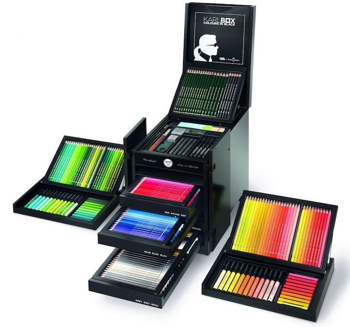 Karlbox is now available at Faber-Castell stores, Karl Lagerfeld boutiques, and Harrods, London. Beautifully curated and packaged, the price tag for this kit is $3,000.