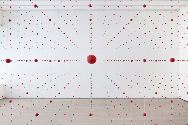 German artist Katharina Hinsberg's installation titled Mitten, roughly translated as Middle, features a network of red beads hanging in a grid-like formation. Each crimson sphere is aligned with the next, creating an intriguing Matrix similar to Muti Randolph's Deep Screen and somewhat reminiscent of Ana Soler's Causa-Efecto. Similarly, Hinsberg's installation is one that visitors can walk into and experience firsthand.