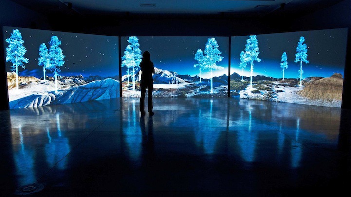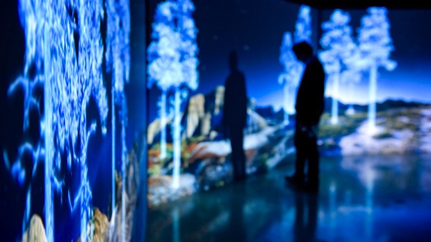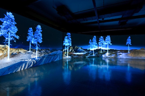 The Erudition is a futuristic landscape installation created by Canada-born artist Kelly Richardson. Combining aesthetics from both cinema and science fiction, the piece is a series of three high-definition screens on which neon blue, holographic trees blow in a fake wind. An eerie silence is occasionally interrupted by the electronic flicker of the trees popping on and off of the screen in random patterns. Visitors can stand in the dark room for hours, pondering the desolate landscape of this fictional planet where there are very few signs of life.
