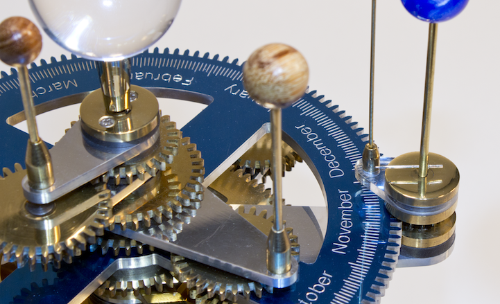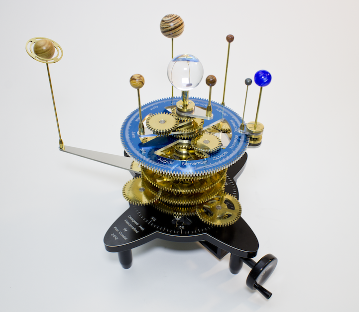 Designer Ken Condal built a mesmerizing orrery (mechanical model of the solar system) with multiple handcrafted gears, wooden and acrylic spheres, and the mechanical engineering help of David Clark. Like a tiny kinetic sculpture, the structure takes motion through a carefully constructed system of gears, which are activated through a winding lever at the bottom.
