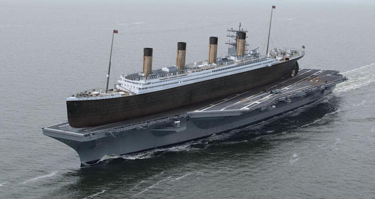 When it was built the Titanic was one of the largest ships built. It's total length was 882 feet and 9 inches long. Since then ship building has come a long way. The United States aircraft carrier the U.S.S. Ronald Reagan is 1,092 feet long. If the Titanic was placed on the deck of the U.S.S. Ronald Reagan the ship would have 210 feet of deck room left.