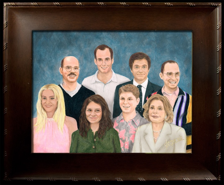 Pop culture artist Kirk Demarais uses his skillful hands to produce color pencil portraits of some of our favorite fictional families from television and films. Whether it's a washed solid color or a red stage curtain, each realistic rendition is accompanied by a cheesy studio portrait backdrop. His list of impressive and fun works range from commercial hit TV characters like Mad Men‘s Don Draper with his traditional nuclear family to eccentric indie film families like the Hoovers from Little Miss Sunshine. Even cult favorites like the Bluth family from Arrested Development and the Weirs from Freaks and Geeks make the cut, to the delight of many pop culture enthusiasts.