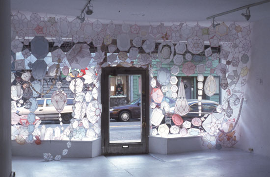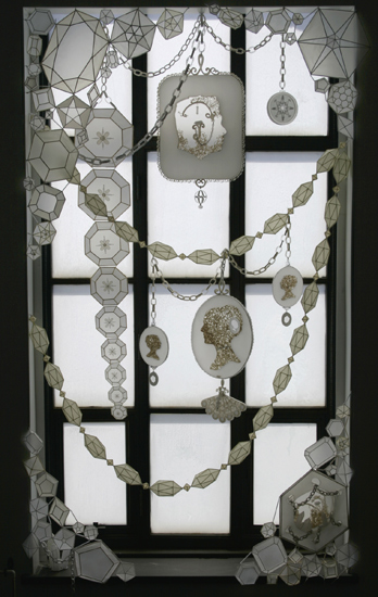 Hasenfeld began working with paper in 1999 and has produced several serial installations over the last decade that address the subject of luxury. Wealth and monetary success is often defined by a bounty of jewels and other expensive crystals. As such, Hassenfeld touches on her own pipe dreams of such prosperity through ordinary materials.