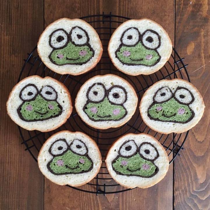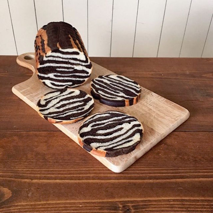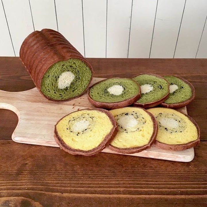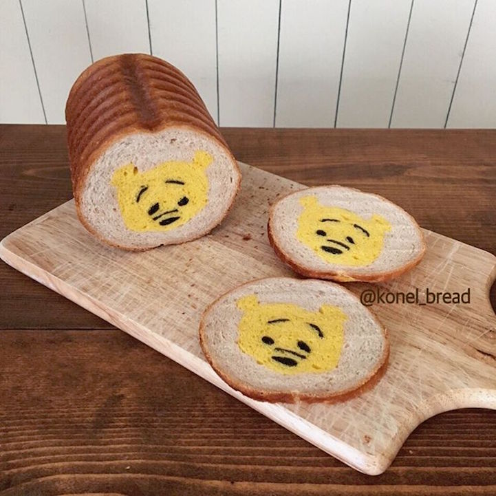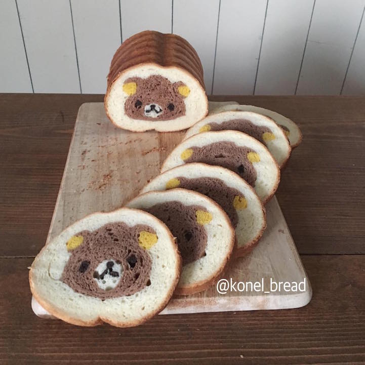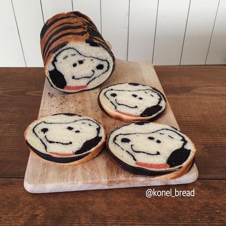 Konel Bread uses natural colors to create these surprising designs. Cocoa, beetroot, and spinach are just some of the ingredients in her repertoire. To form the interior illustrations, she employs an approach similar to making deco-sushi: long, rounded pieces of dough are positioned within larger chunks that form the outer loaf. This relatively simple method yields great results—especially with the Peanut characters and Totoro. Sandwiches have never been so charming.