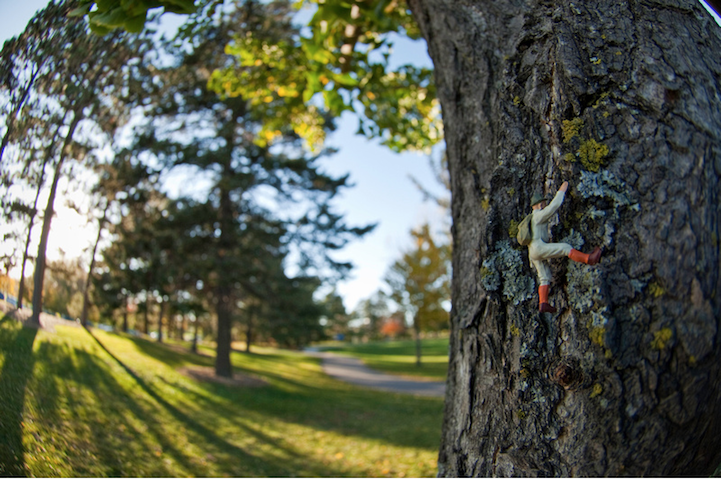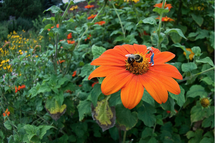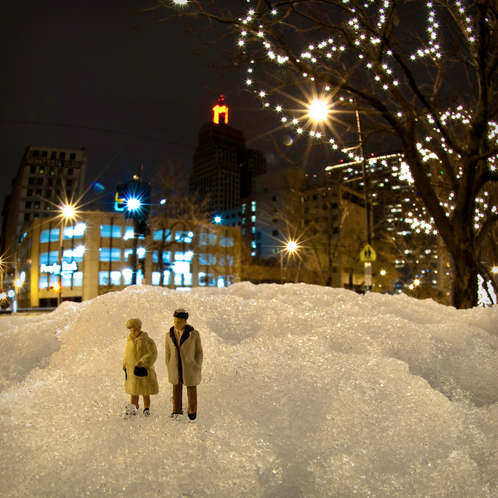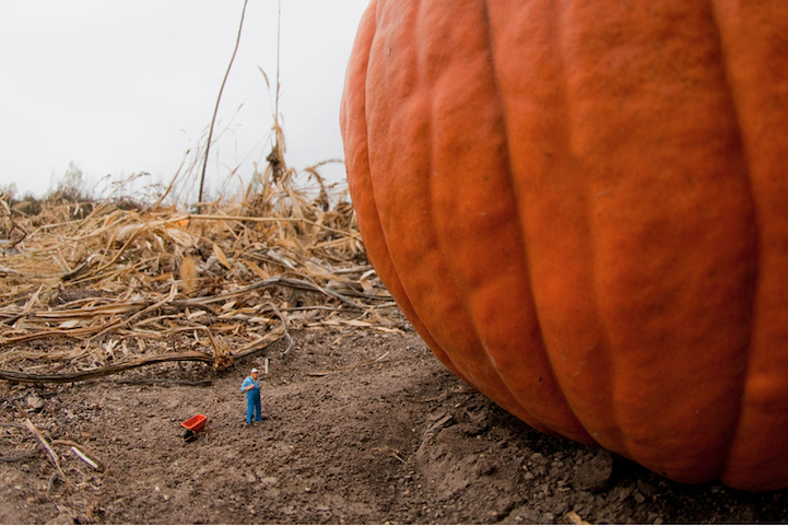 These photographs by Kurt Moses transport us into the adventures of a small, small world. Un Petit Monde is an intriguing and amusing collection of tiny people arranged in macro lens settings. Moses teams up with his wife Edwige to create the intricate scenes involving characters in everyday life situations–walking the dog or playing in the snow–as well as not-so-everyday scenes–facing the challenge of transporting a gigantic pumpkin or escaping the attack of a giant squid!