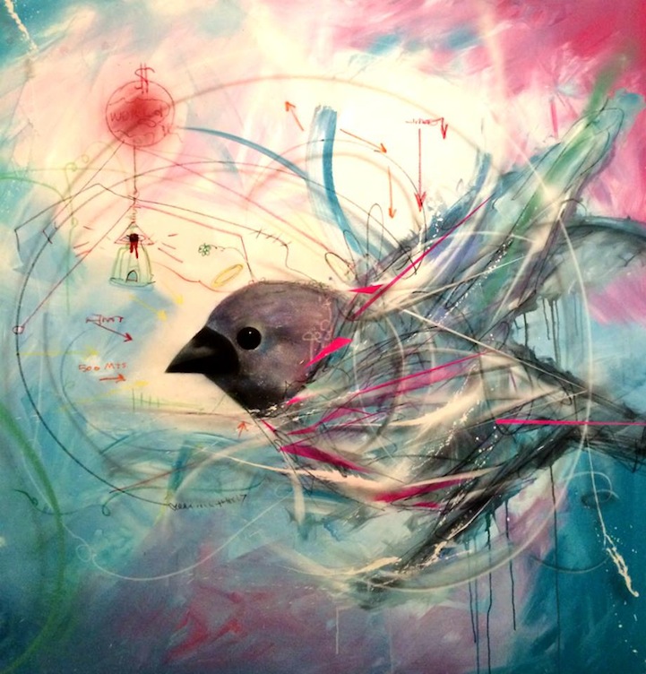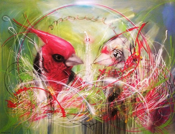 Brazilian street artist Luis Seven Martins, aka L7m, continues to produce amazing illustrations that blur the lines between abstraction and nature. Rather than taking to the streets, this time L7m turned his spray paint and acrylics to a number of canvases. His expressive collection features stunning bird forms that emerge from a beautifully chaotic background. It's as if the creatures are peacefully emerging from the energetic confusion of his blended brush strokes.