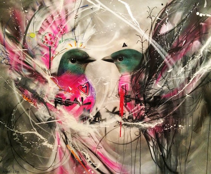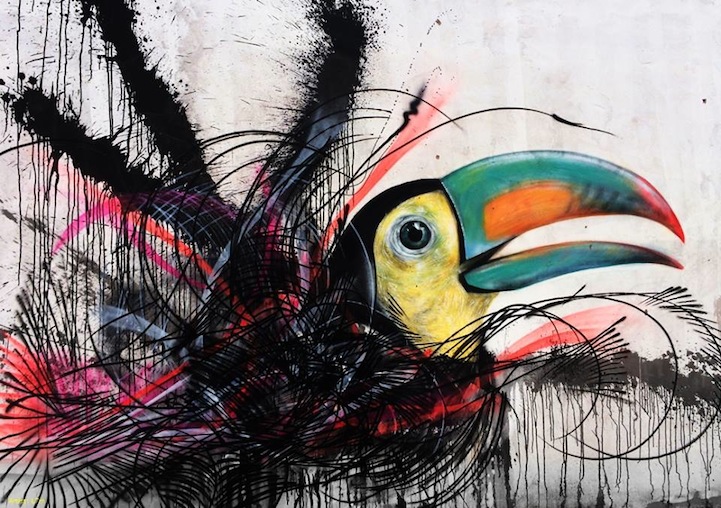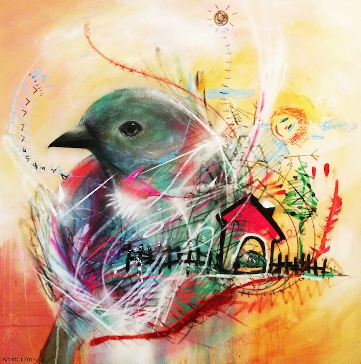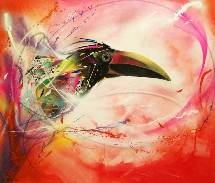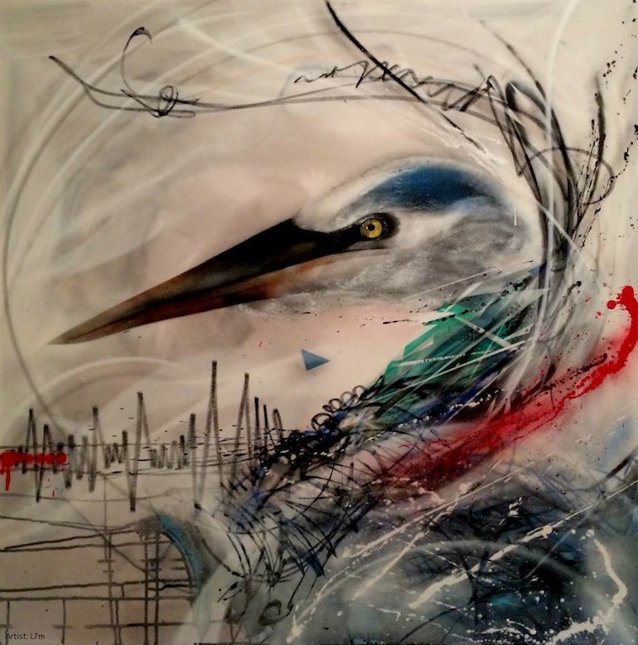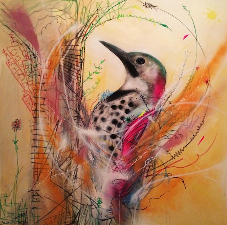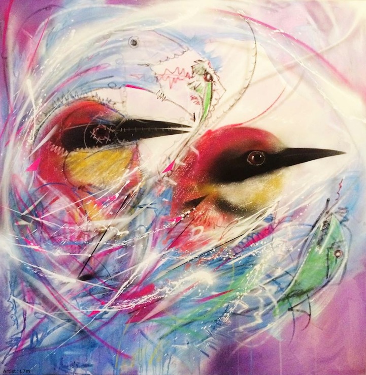 The artist uses a variety of techniques to create circular swirls of bold colors that are juxtaposed with the realistic birds. His signature style adds motion to each piece and creates a sense of disorder that emanates from the composition. Through his work, L7m strives to create “contradictions and uncomfortable feelings in the observers” by exploring ideas of nature and beauty mixed with the chaos of our urban environment.