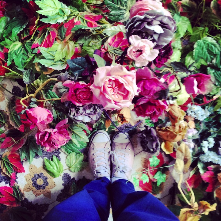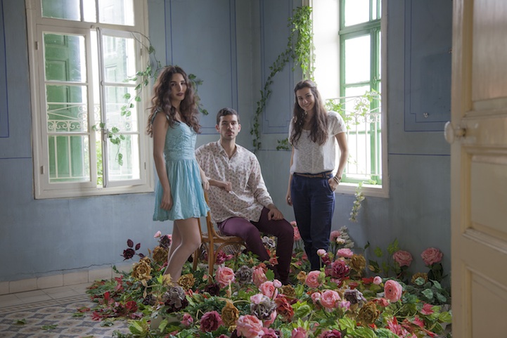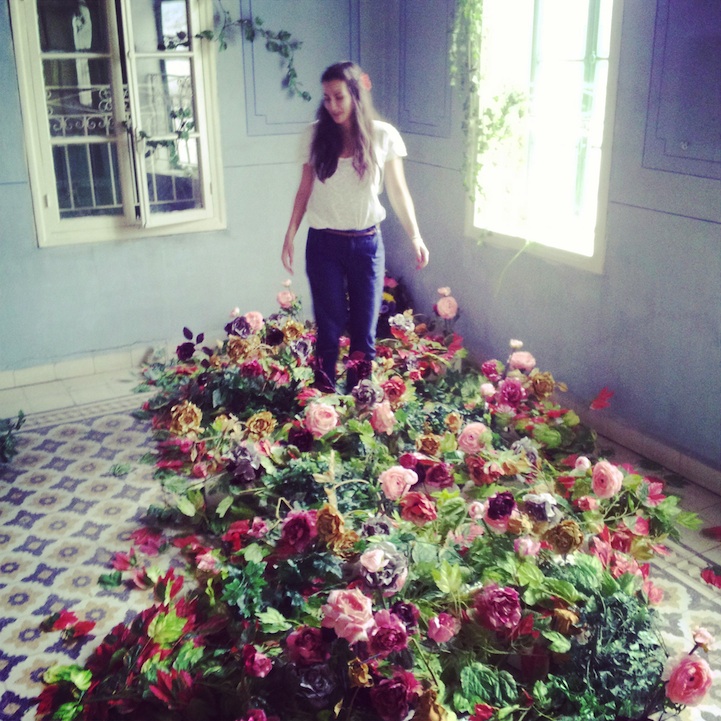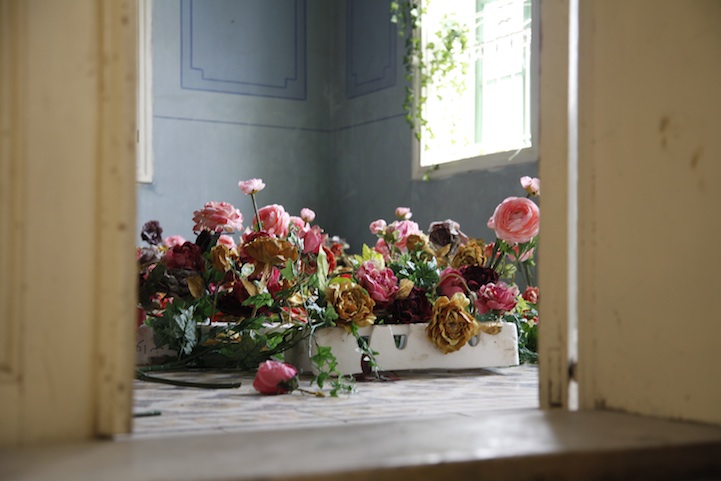As Lara tells us, “We drove for two-and-a-half hours to my hometown in the south of Lebanon (Hasbaya) with huge flower sacs on our laps. The concept struck in my mind a month ago: A beautiful garden overtaking a blue room. Faysal, whose flower-filled Halloween costume was etched in my mind from a few months ago, was the perfect collaborator. I called him and we spent the last two weekends shopping for artificial flowers.