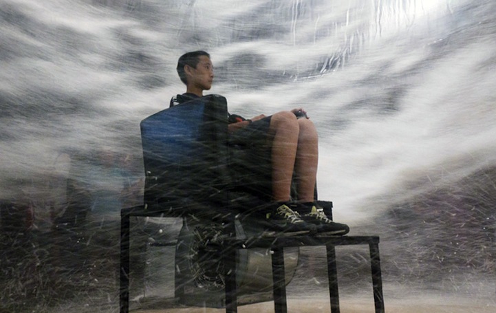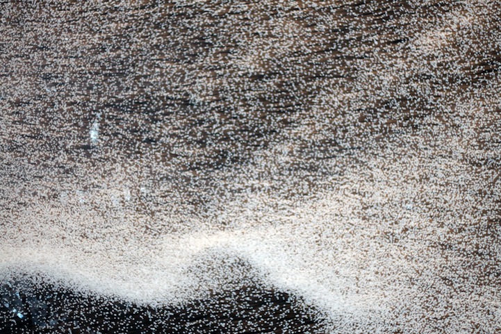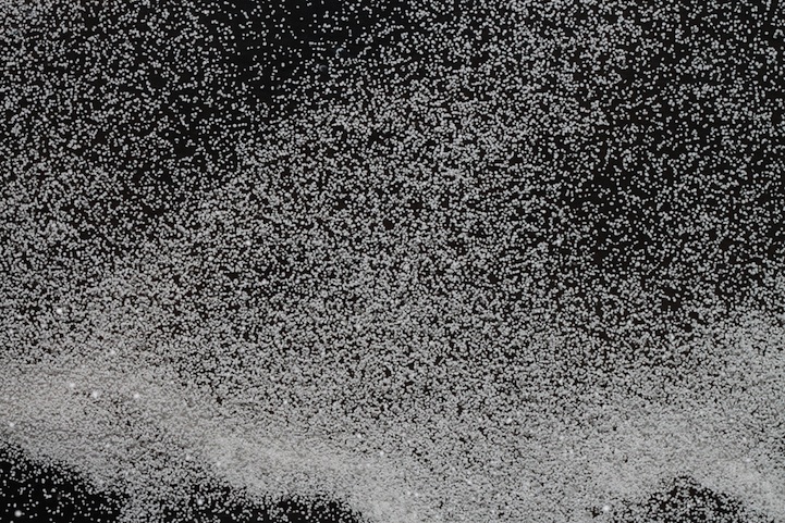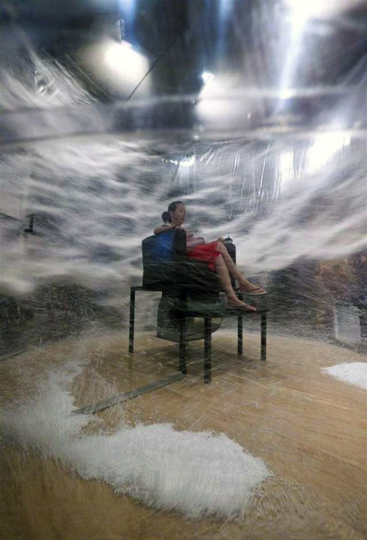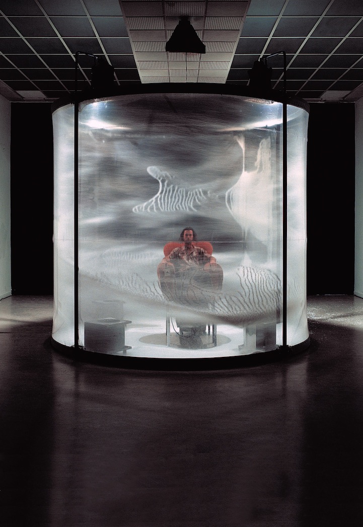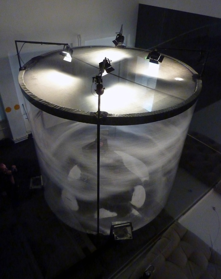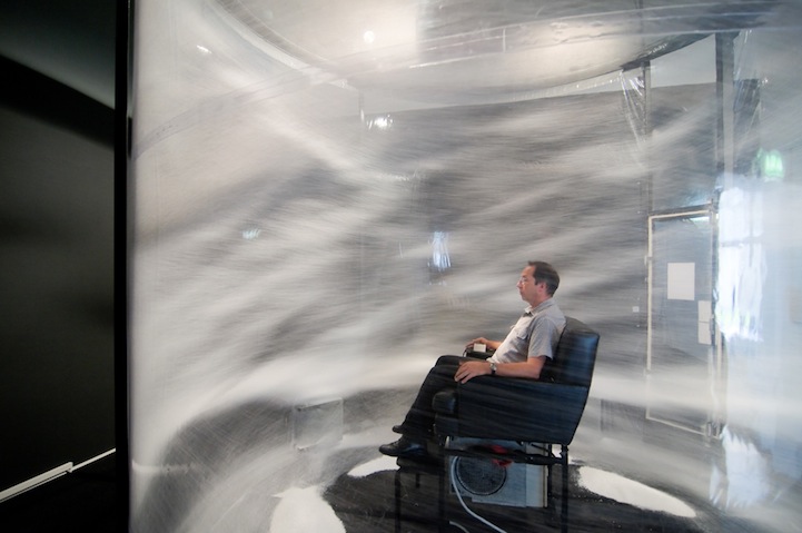 Nemo Observatorium is a spectacular whirlwind chamber by artist Lawrence Malstaf that allows visitors to sit in the center of a styrofoam storm. The tiny white beads circle furiously around the centric sitter like an abstract performance mimicking nature. Participants are given an opportunity to be at the center of a unique audiovisual experience within a cylindrical PVC tank.