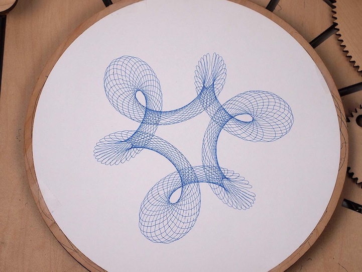 Each Cycloid Drawing Machine package comes with all its required parts, including a base, three geared turntables, 18 wooden gears, colored pens and paper. Everything is easily tightened by hand and requires no special tools. According to LEAFpdx, “Setup can be as easy as adding one gear and taping a piece of paper onto the turntable.” See the possibilities with this product in the video below.