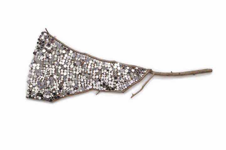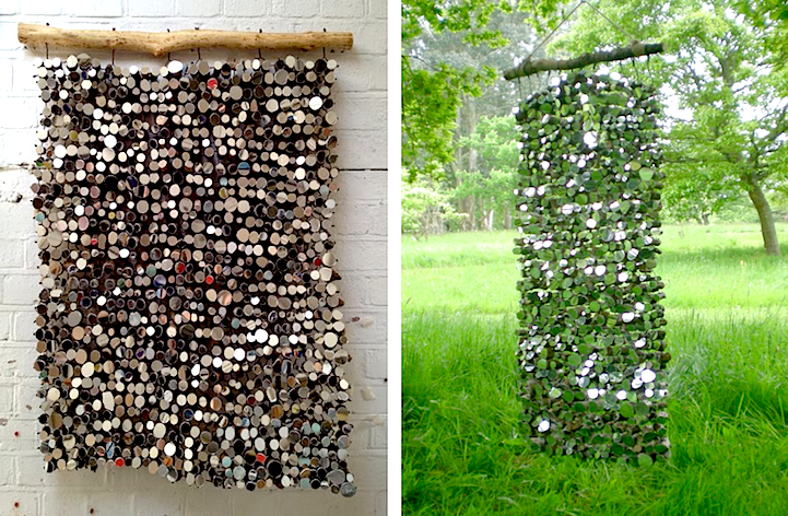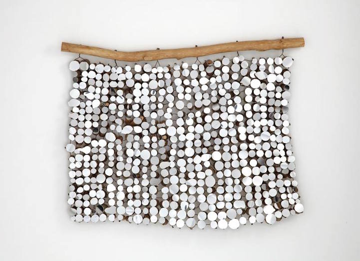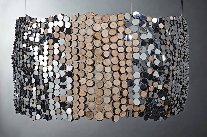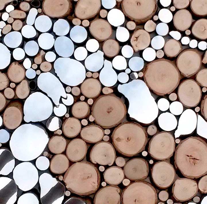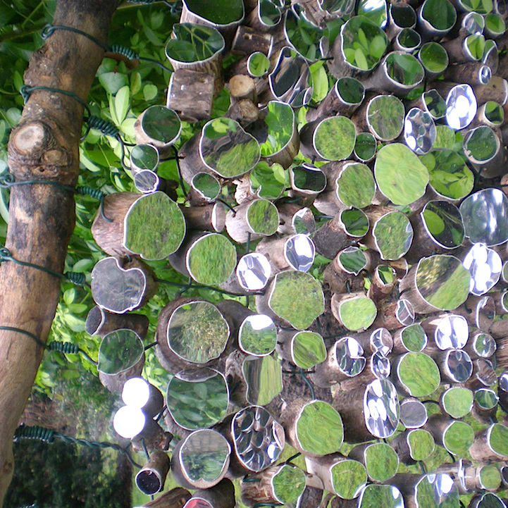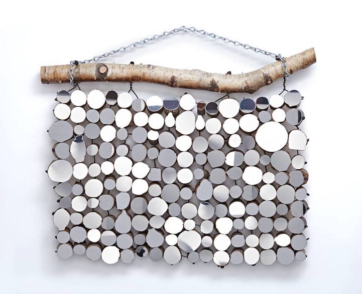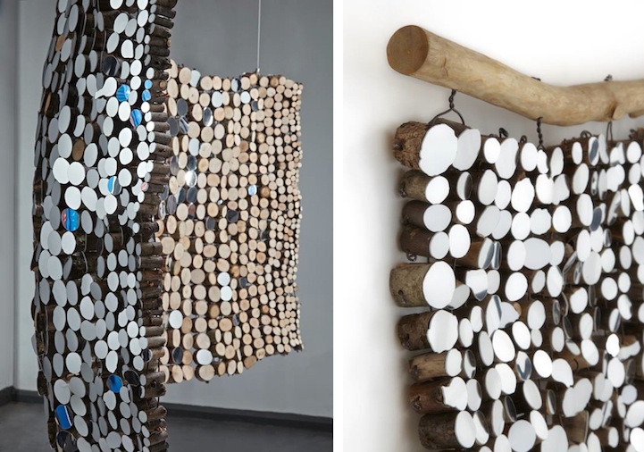 Each sculpture and installation utilizes natural, organic, and reclaimed materials to present visual unity between man and nature. For her pieces that are taken out of their natural environment, chunks of wood are bound together by wire and hung from an unvarnished branch. What you may not realize at first is that the mirrors have actually been cut to resemble the distinct bumps and curves of the wooden surfaces they're attached to. This presentation allows for a bit of modernity to bond with nature in a harmless fashion.
