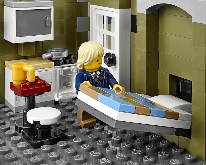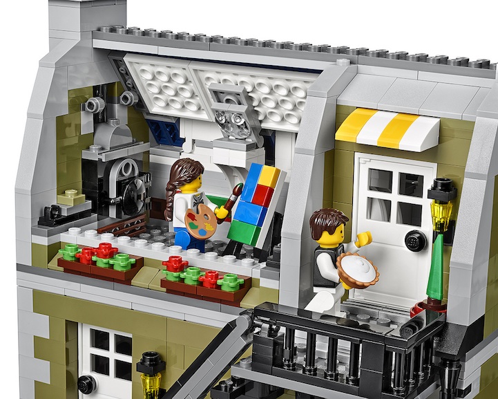 Just unveiled at BrickCon in Seattle is this beautiful new set in LEGO's modular building series, 10243 Parisian Restaurant. Released in January 2014, the highly detailed model includes 2,469 pieces that make up much more than what you see on the outside. In this three story building, you'll find some neat rooms inside! On the first floor is a fully-stocked, blue and white tiled kitchen, while on the second floor you'll find a cozy apartment with a kitchenette and pull-down bed. The third floor is reserved for the artist who's hard at work in his studio.
