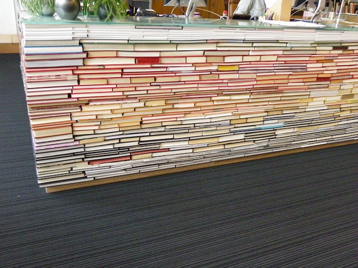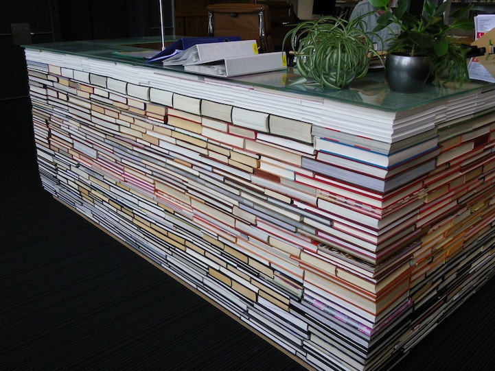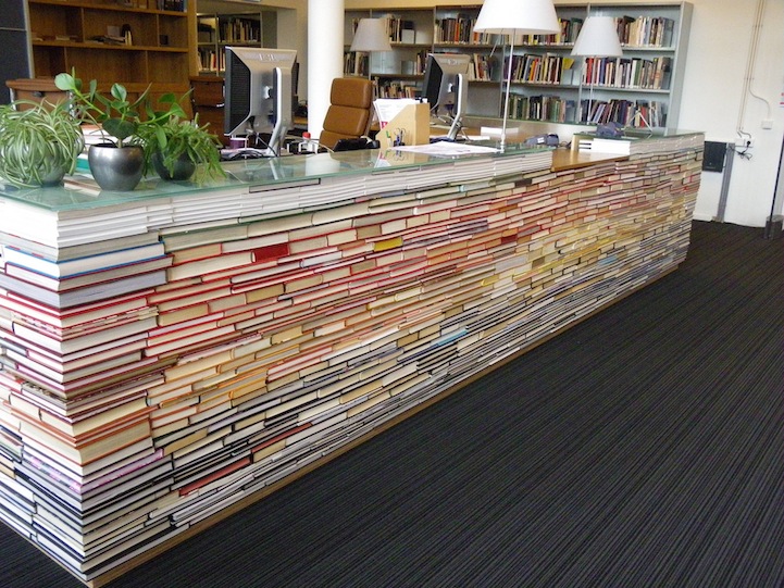 Whoever thought of this idea is pretty bright… After a devastating fire in the Architecture building burned down a portion of the library, Delft University of Technology in the Netherlands purchased a new collection to replace the old volumes. Instead of throwing away the old, unburned books, they stacked them up to create this awesome administrative desk, which they appropriately placed in the library.