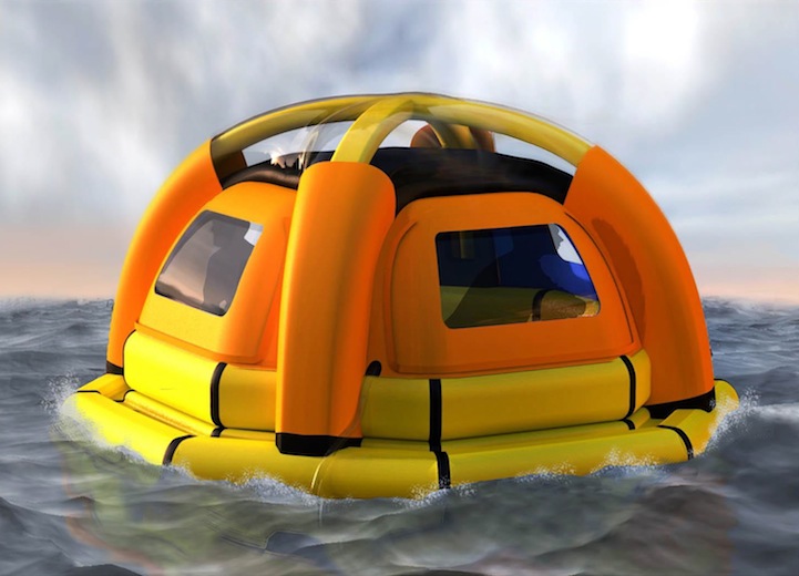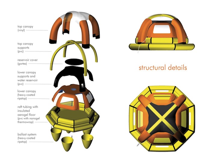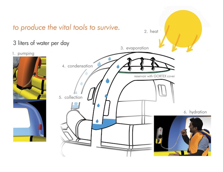 The process starts by pumping sea water up to a Gortex covered reservoir, where the water is subject to evaporation. The evaporated water then hits the top canopy and condenses, filling the four pockets around the raft with fresh drinking water. The Gortex cover over the reservoir allows the vapor molecules to escape, but holds in the larger liquid molecules, preventing the pockets of fresh water from becoming contaminated by the sea water. This produces enough water for up to five passengers to stay sufficiently hydrated.