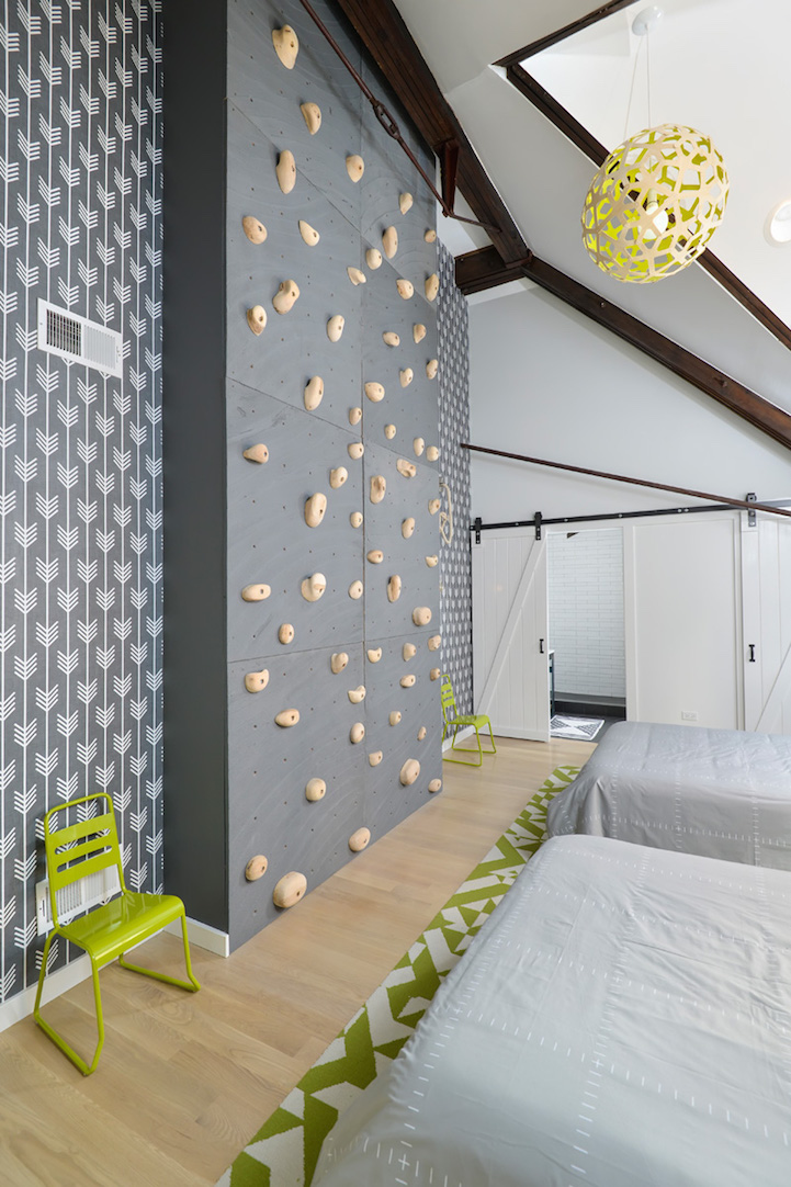 Linc Thelen Design and Scrafano Architects collaborated to make this project a reality, and they had their work cut out for them. The great room had its 25-foot ceiling exposed in order to showcase its timber beams, and a floating steel staircase was installed with a glass rail system. Linc also custom designed the dining room table, a climbing wall for one of the bedrooms, and a murphy bed that folds down in the nursery.